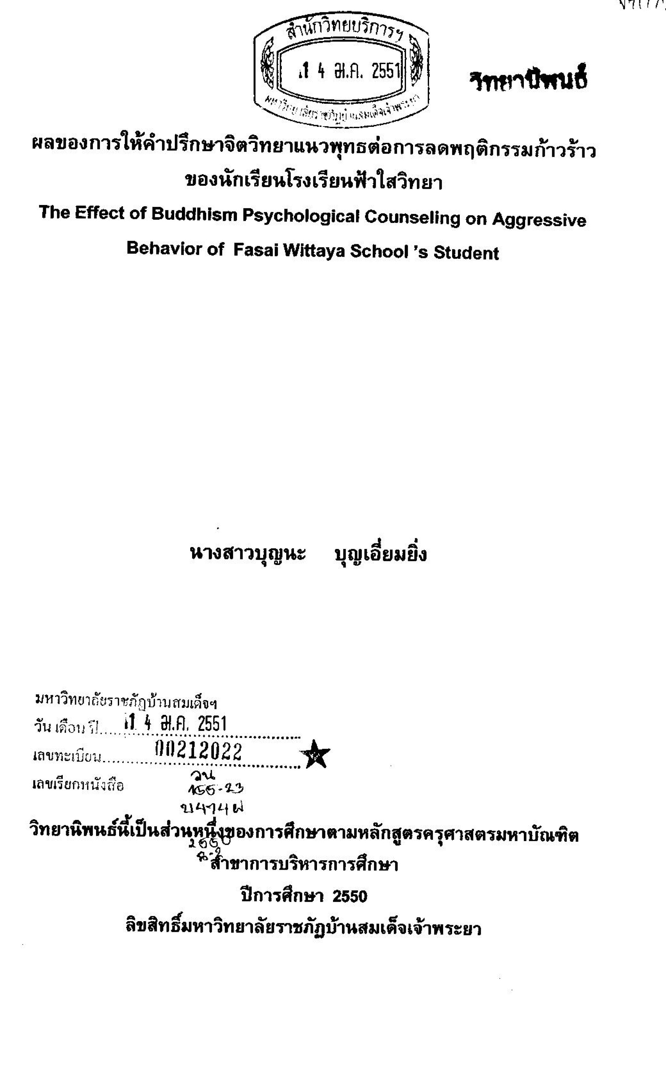 ผลของการให้คำปรึกษาจิตวิทยาแนวพุทธต่อการลดพฤติกรรมก้าวร้าวของนักเรียนโรงเรียนฟ้าใสวิทยา