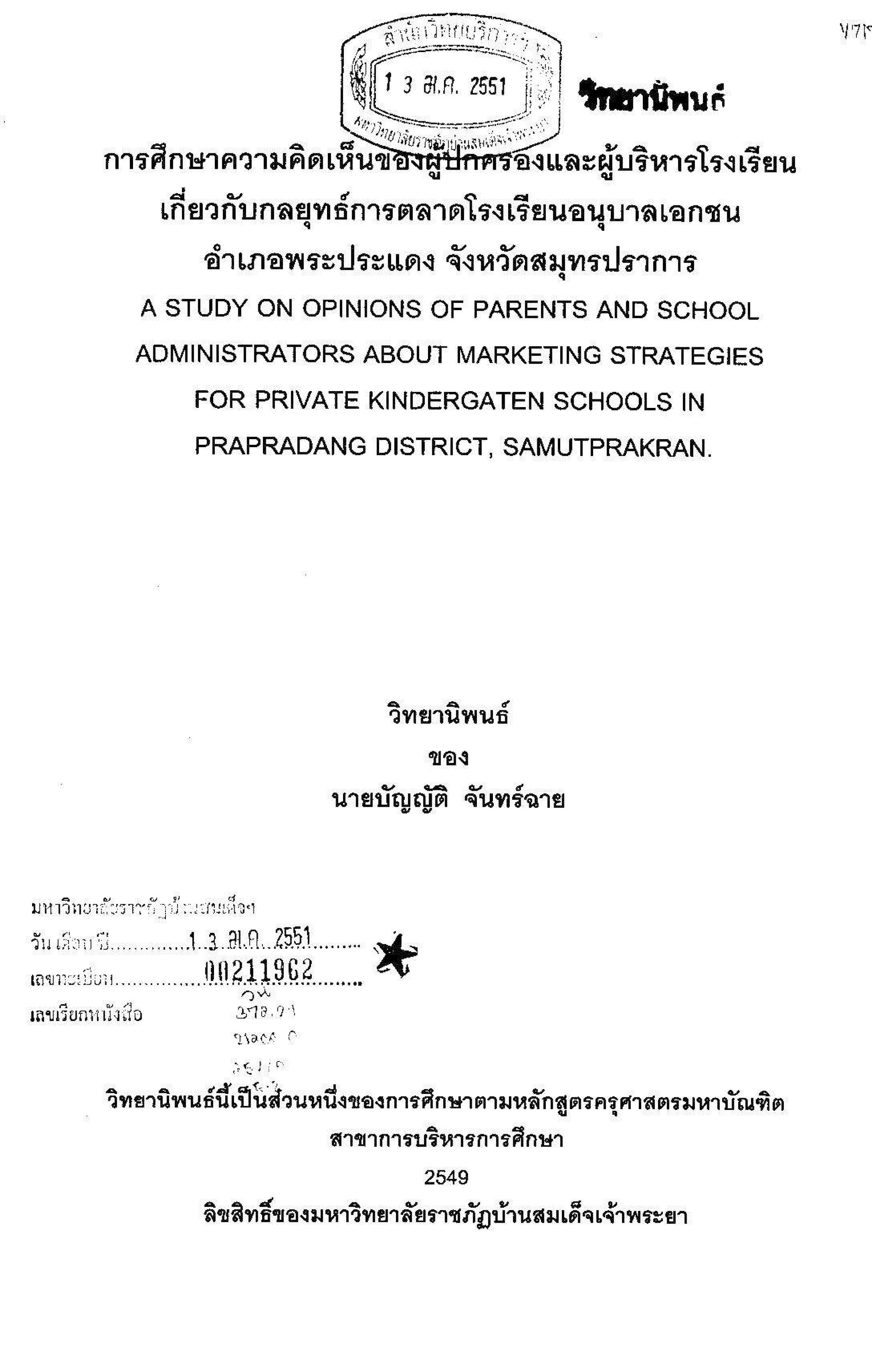 การศึกษาความคิดเห็นของผู้ปกครองและผู้บริหารโรงเรียนเกี่ยวกับกลยุทธ์การตลาดโรงเรียนอนุบาลเอกชน อำเภอพระประแดง จังหวัดสมุทราปราการ
