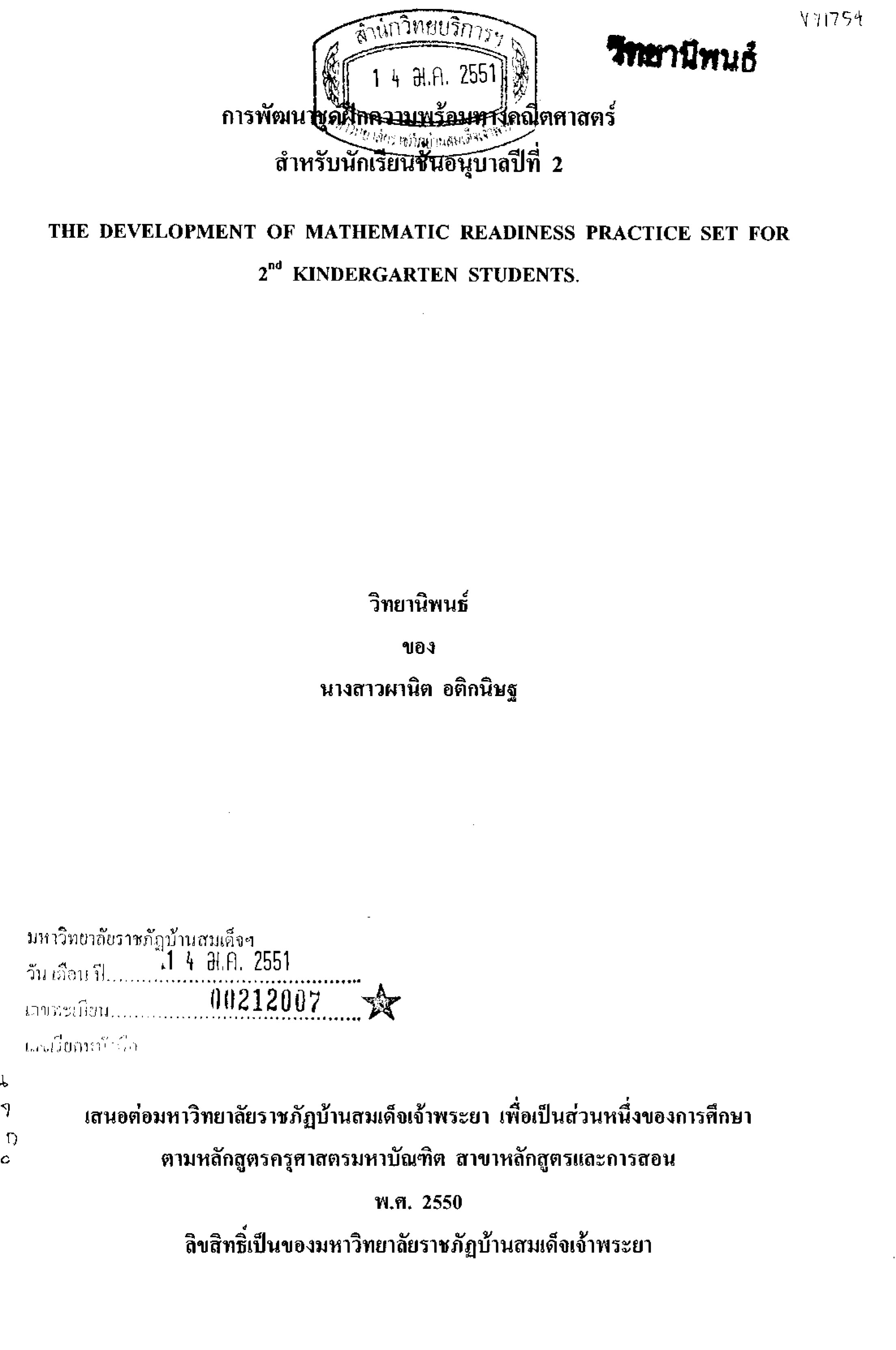 การพัฒนาชุดฝึกความพร้อมทางคณิตศาสตร์ สำหรับนักเรียนชั้นอนุบาล 2