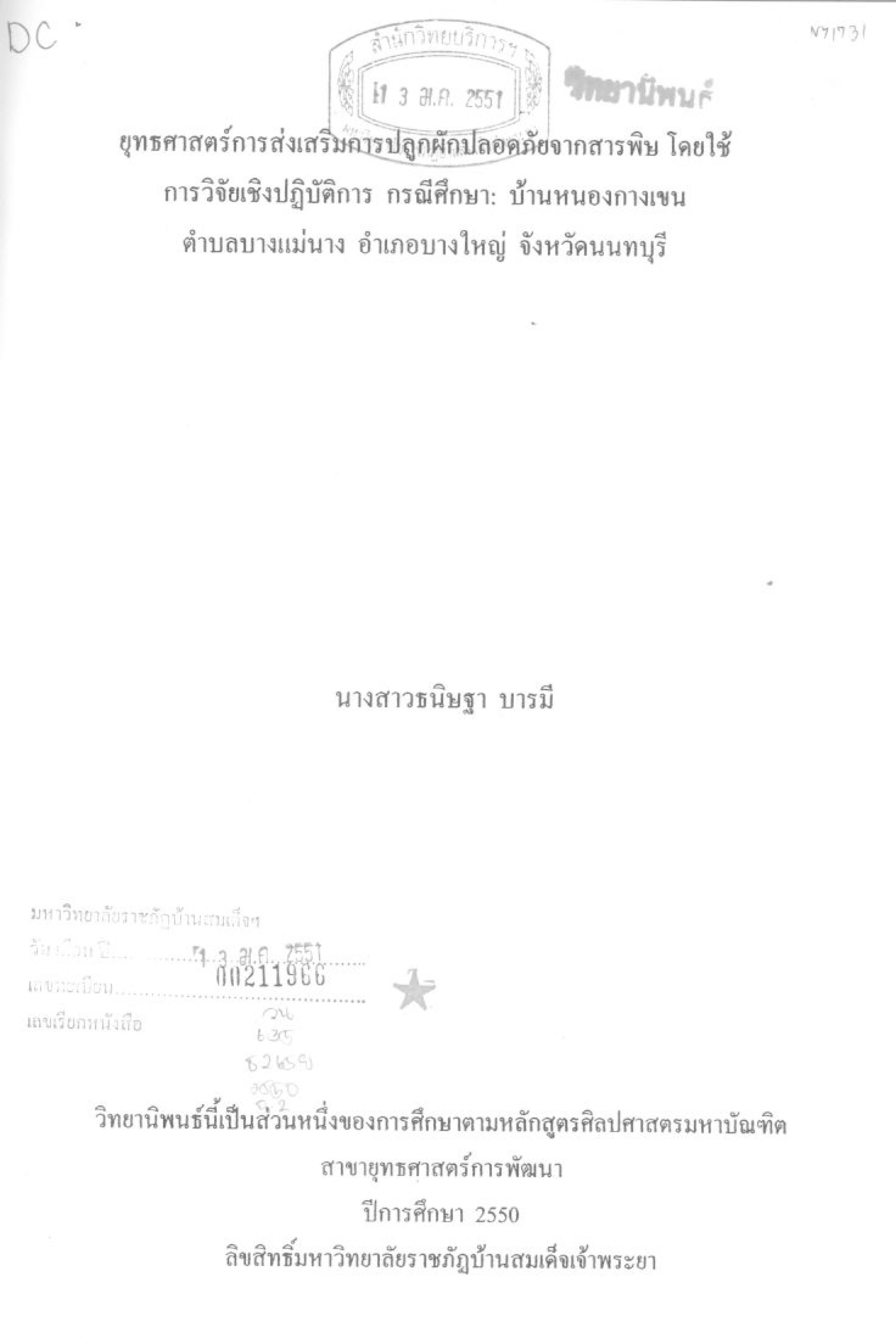 ยุทธศาสตร์การส่งเสริมการปลูกผักปลอดภัยจากสารพิษ โดยใช้การวิจัยเชิงปฏิบัติการ กรณีศึกษา: บ้านหนองกางเขน ตำบลบางใหญ่ จังหวัดนนทบุรี