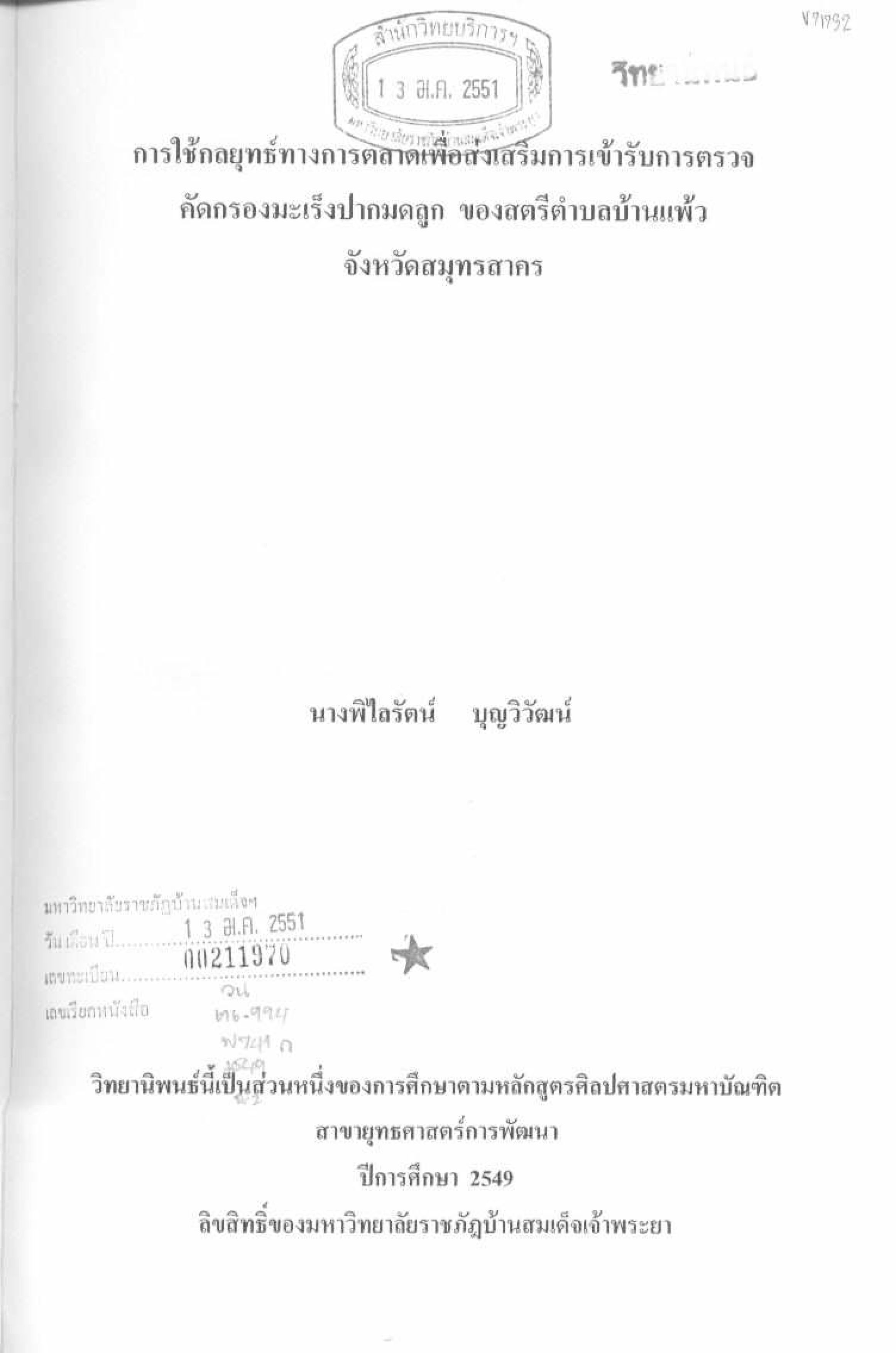 การใช้กลยุทธ์ทางการตลาดเพื่อส่งเสริมการเข้ารับการตรวจคัดกรองมะเร็งปากมดลูกของสตรี ตำบลบ้านแพ้ว จังหวัดสมุทรสาคร