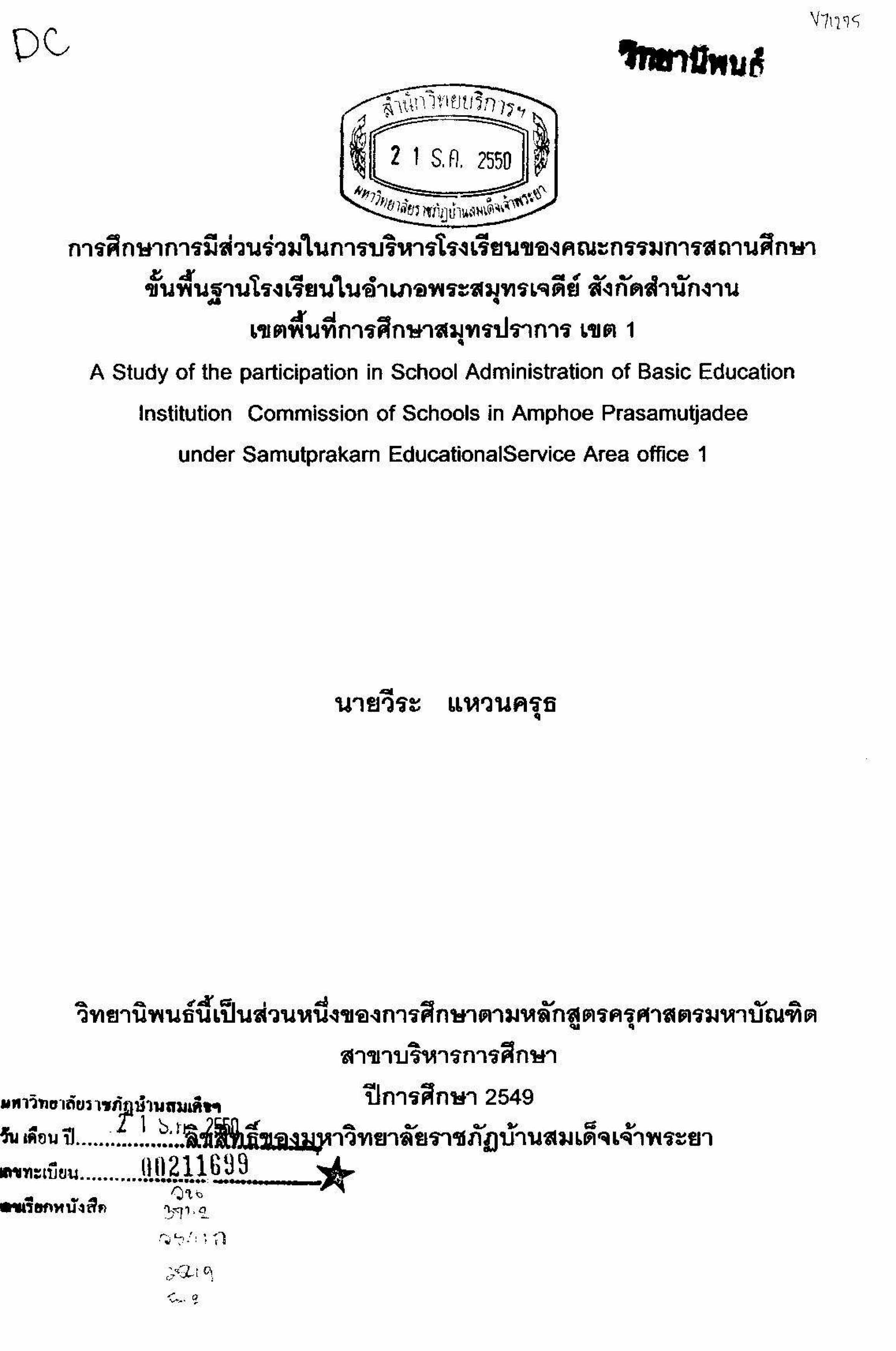 การศึกษาการมีส่วนร่วมในการบริหารโรงเรียนของคณะกรรมการสถานศึกษาขั้นพื้นฐานโรงเรียนในอำเภอพระสมุทรเจดีย์ สังกัดสำนักงานเขตพื้นที่การศึกษาสมุทรปราการ เขต 1