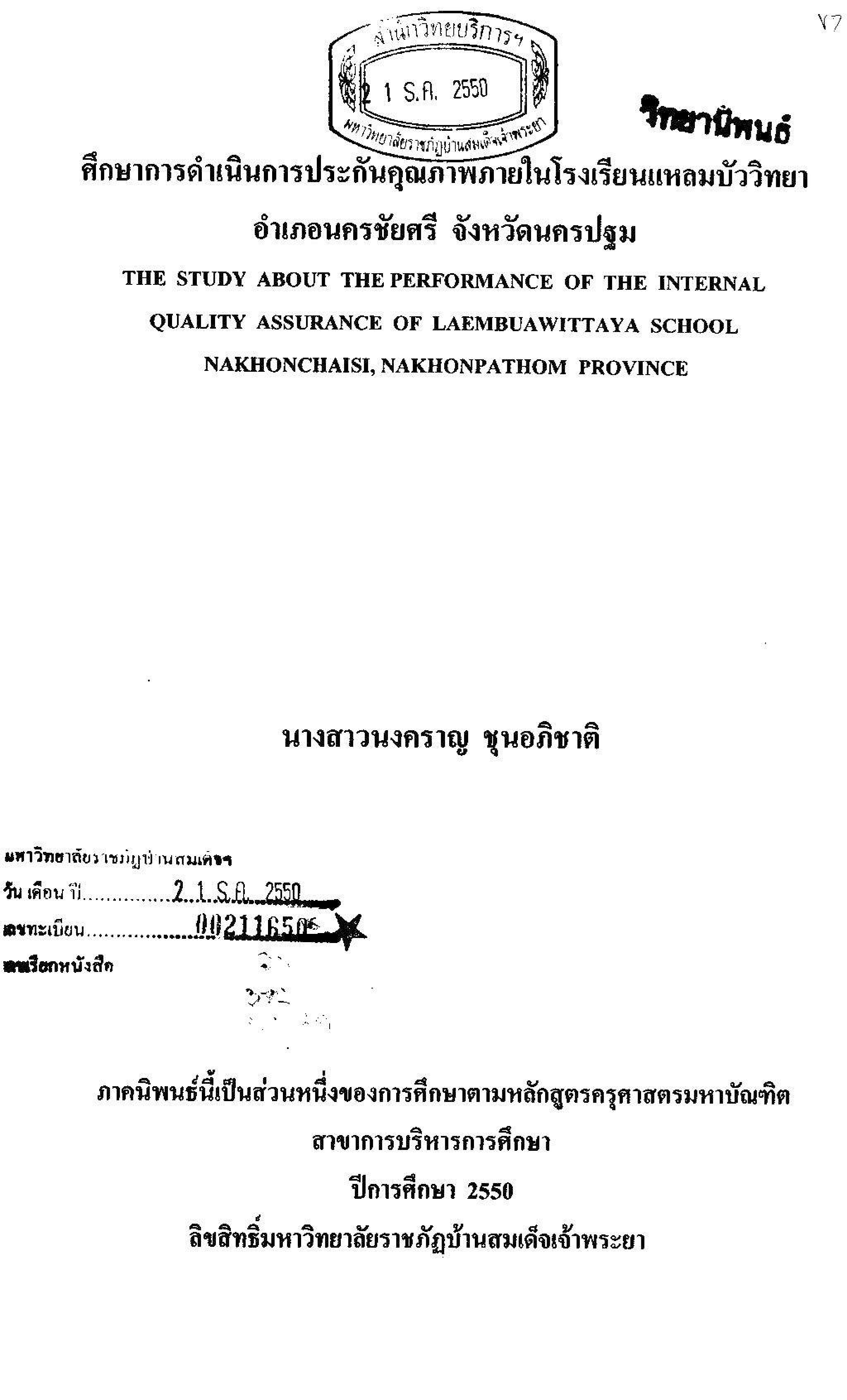 การศึกษาการดำเนินการประกันคุณภาพภายในโรงเรียนแหลมบัววิทยา อำเภอนครชัยศรี จังหวัดนครปฐม