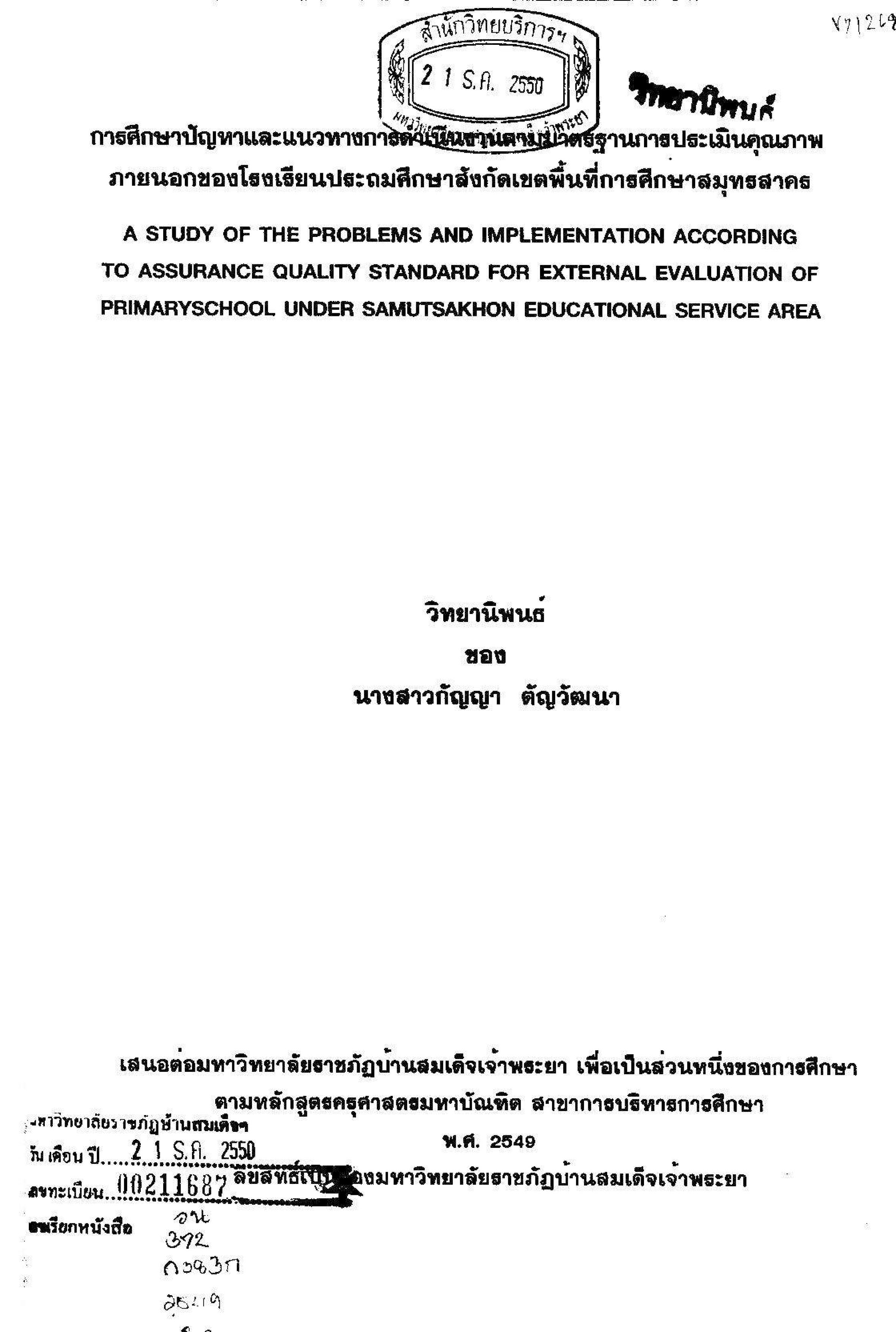 การศึกษาปัญหาและแนวทางการดำเนินงานตามมาตรฐานการประเมินคุณภาพภายนอกโรงเรียนประถมศึกษาสังกัดพื้นที่การศึกษาสมุทรสาคร