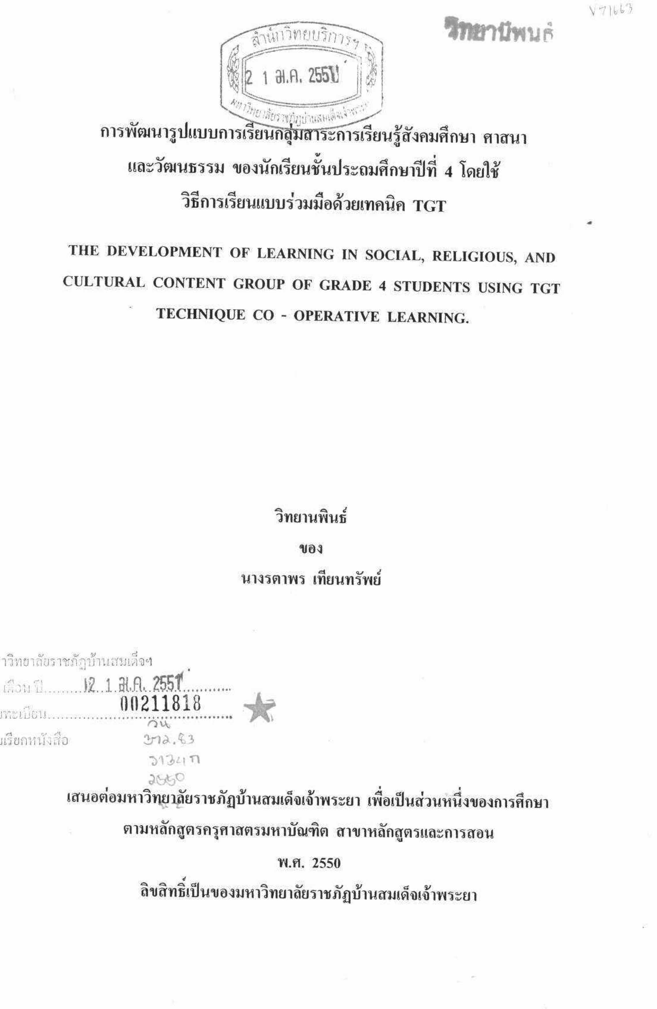 การพัฒนารูปแบบการเรียนกลุ่มสาระการเรียนรู้สังคมศึกษา ศาสนาและวัฒนธรรม ของนักเรียนประศึกษาปีที่ 4 โดยใช้วิธีการเรียนแบบร่วมมือด้วยเทคนิค TGT