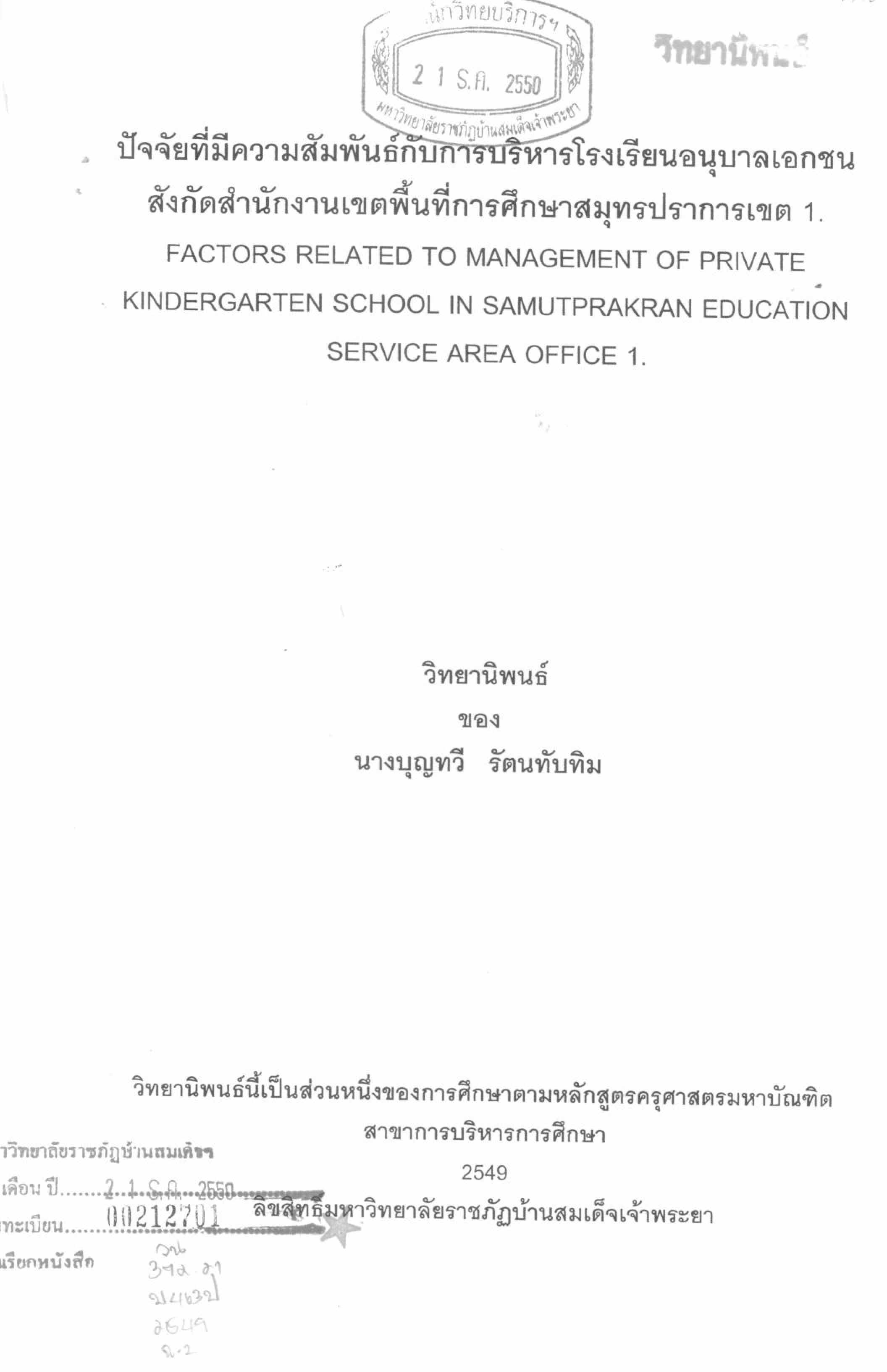 ปัจจัยที่มีความสัมพันธ์กับการบริหารโรงเรียนอนุบาลเอกชนสังกัดสำนักงานเขตพื้นที่การศึกษาสมุทรปราการเขต 1