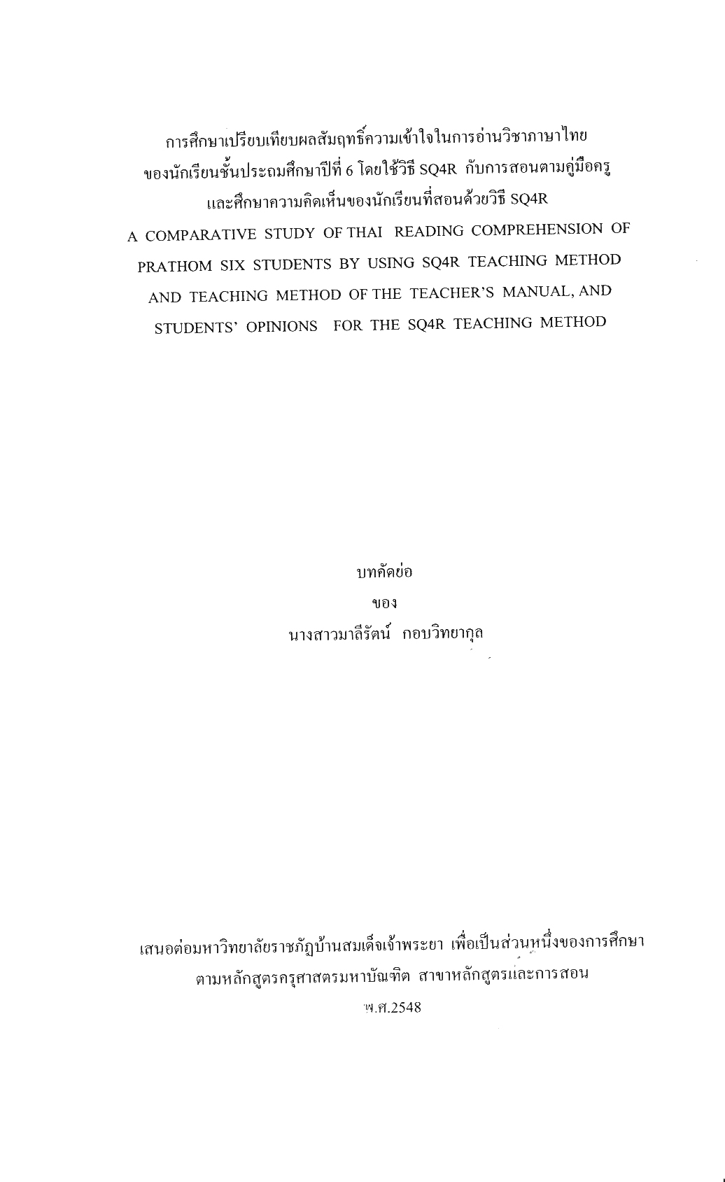 การศึกษาเปรียบเทียบลผลสัมฤทธิ์ความเข้าใจในการอ่านวิชาภาษาไทยของนักเรียนชั้นประถมศึกษาปีที่ 6 โดยใช้วิธี SQ4R กับการสอนตามคู่มือครูและศึกษาความคิดเห็นของนักเรียนที่สอนด้วยวิธี SQ4R