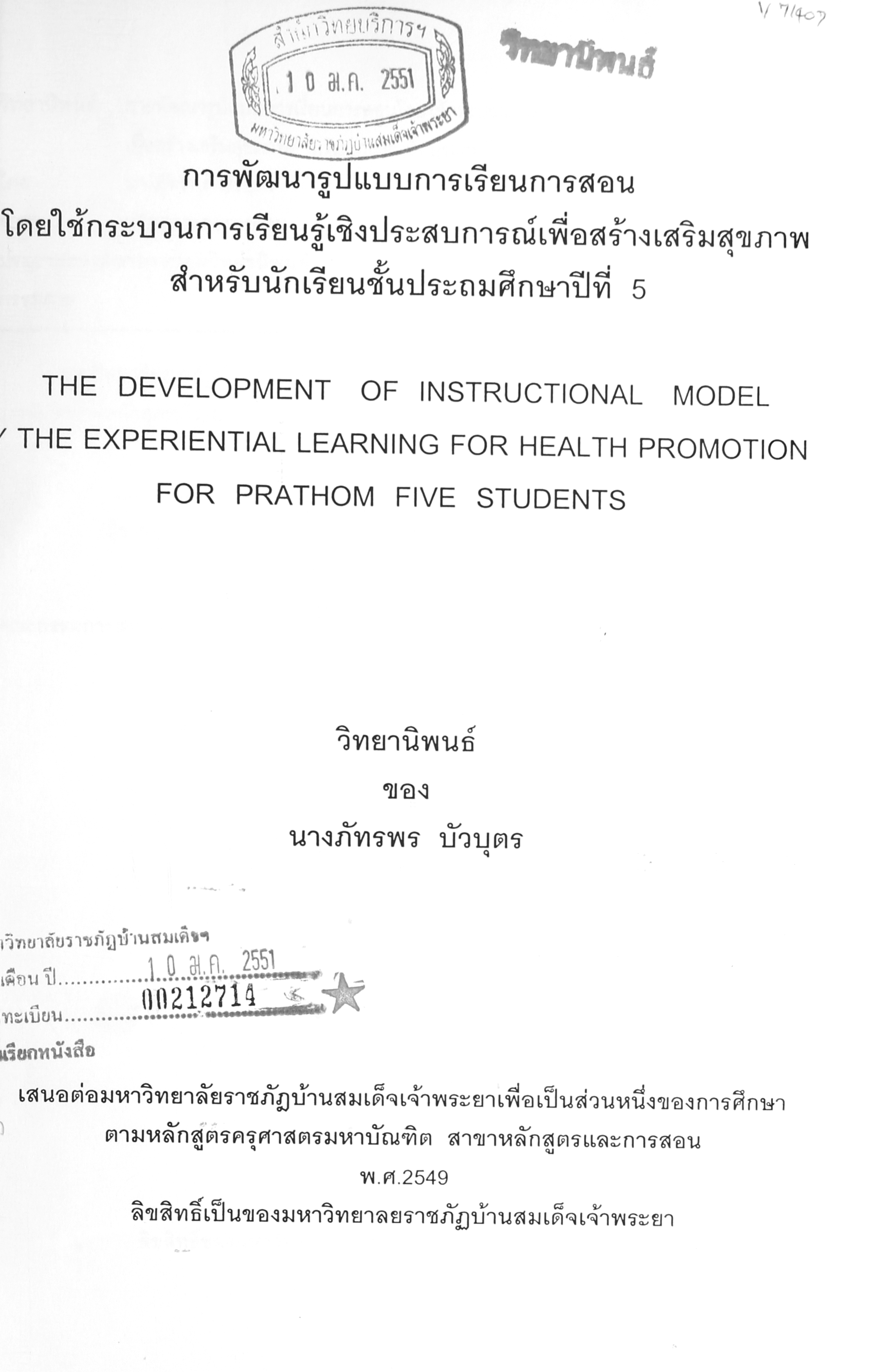 การพัฒนารูปแบบการเรียนการสอน โดยใช้กระบวนการเรียนรู้เชิงประสบการณ์เพื่อสร้างเสริมสุขภาพ สำหรับนักเรียนชั้นประถมศึกษาปีที่ 5