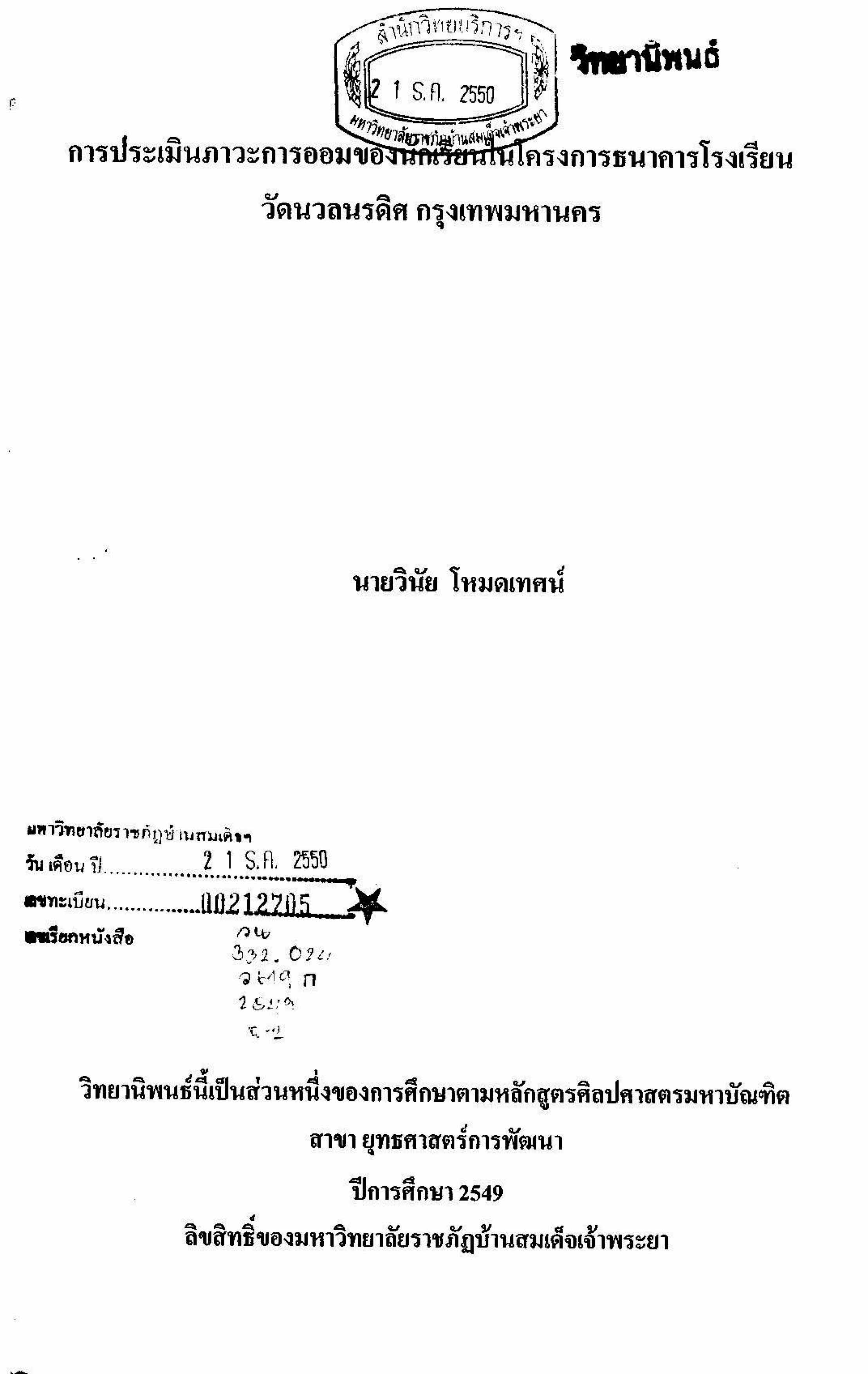 การประเมินภาวะการออมของนักเรียนในโครงการธนาคารโรงเรียนวัดนวลนรดิศ กรุงเทพมหานคร