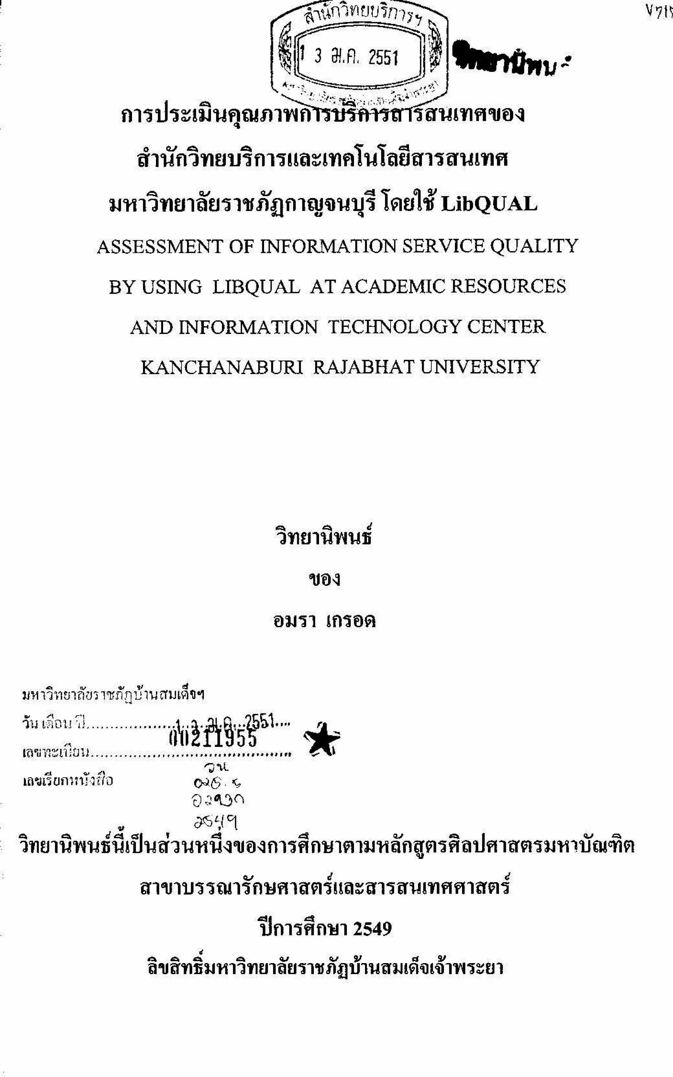 การประเมินการบริหารสารสนเทศของสำนักวิทยบริการและเทคโนโลยีสารสนเทศมหาวิทยาลัยราชภัฏกาญจนบุรี โดยใช้ LibQUAL