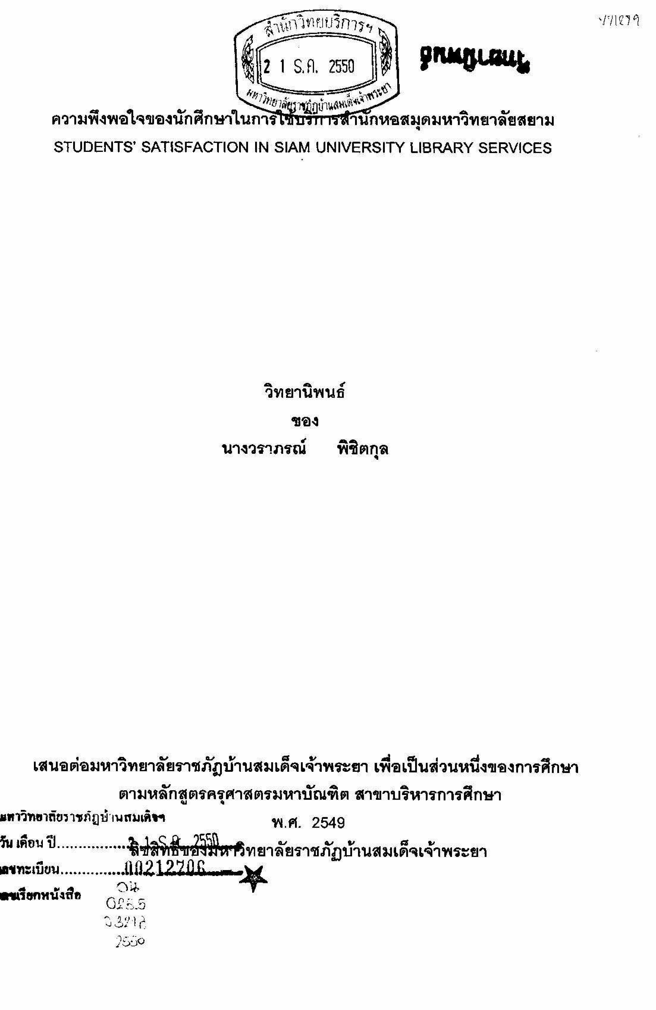 ความพึงพอใจของนักศึกษาในการใช้บริการสำนักหอสมุดมหาวิทยาลัยสยาม