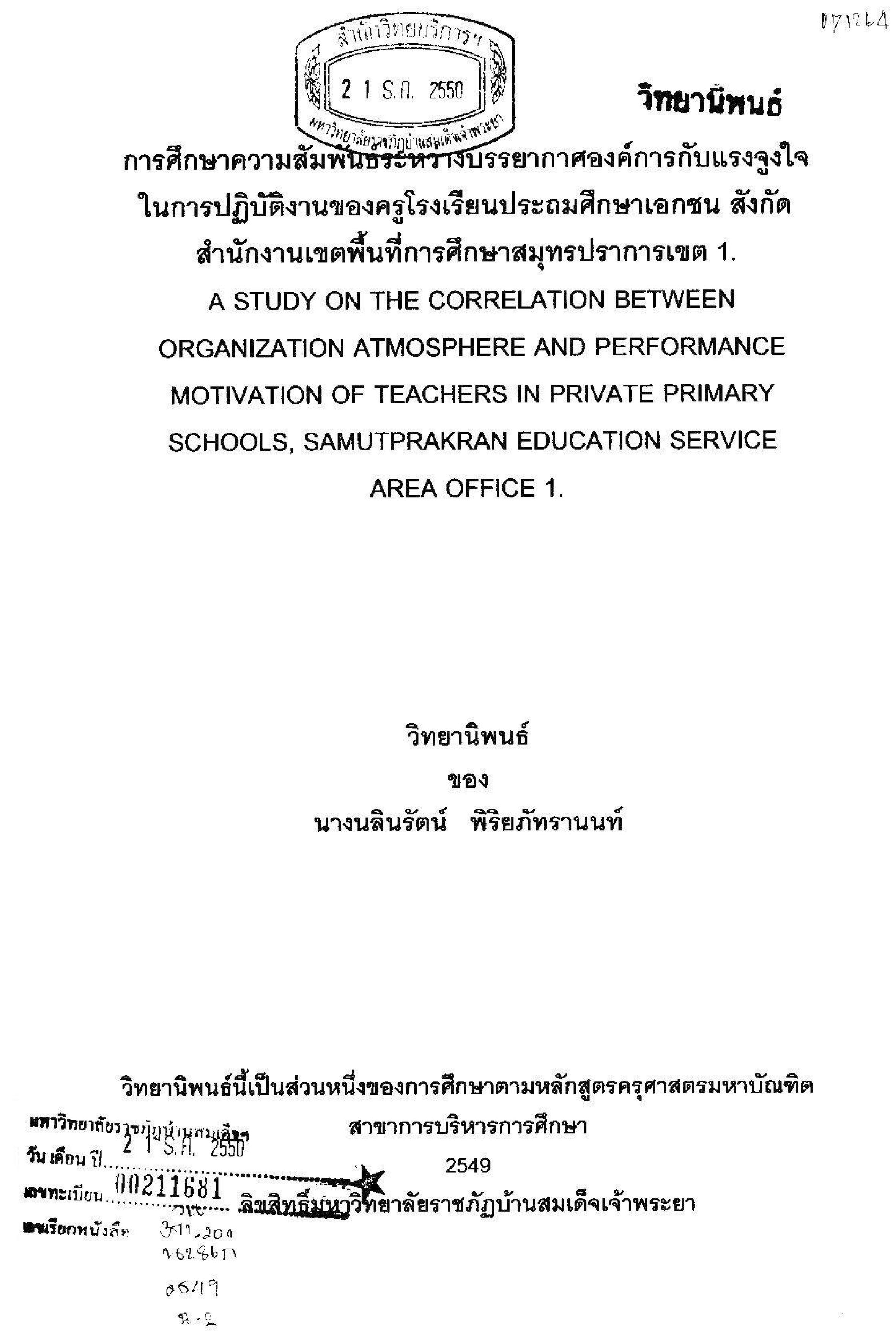 การศึกษาความสัมพันธ์ระหว่างบรรยากาศองค์การกับแรงจูงใจในการปฏิบัติงานของครูโรงเรียนประถมศึกษาเอกชน สังหักสำนักงานเขตพื้นที่การศึกษาสมุทราปราการเขต 1