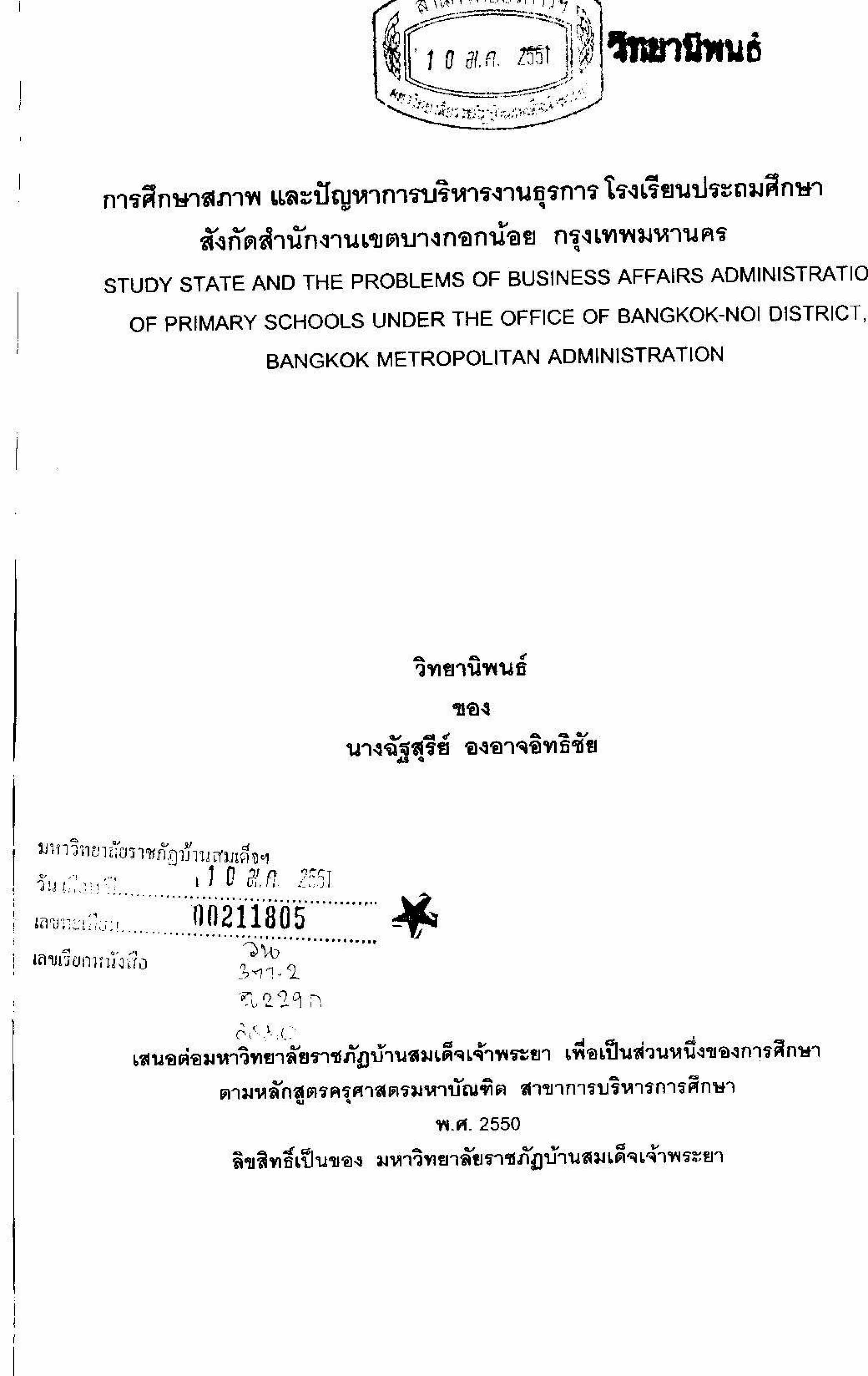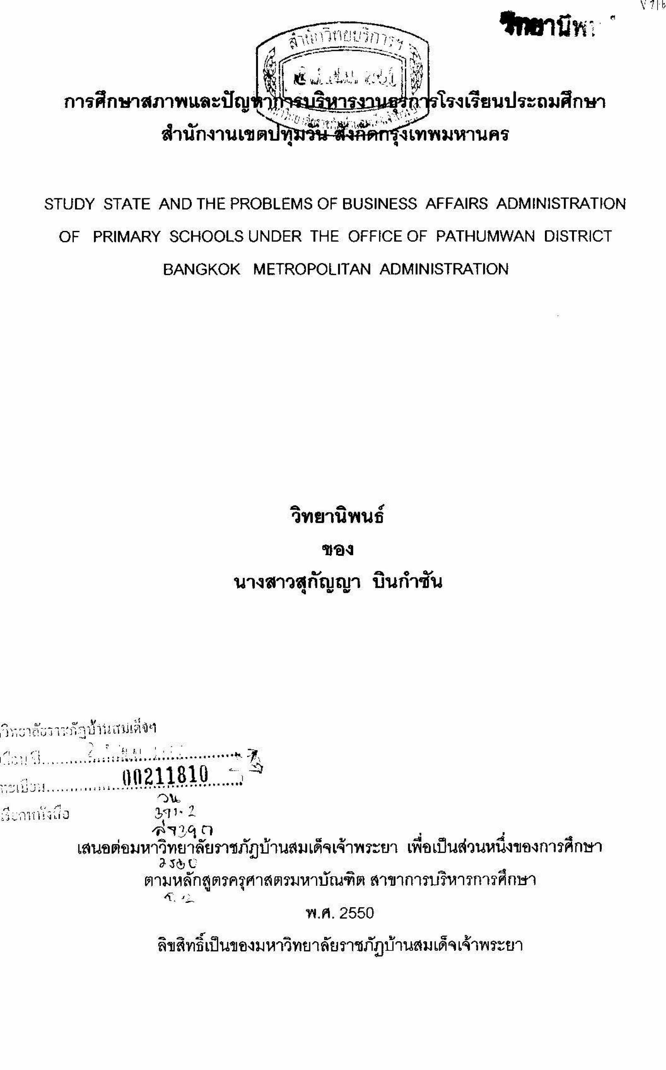 การศึกษาสภาพและปัญหาการบริหารงานธุรการโรงเรียนประถมศึกษา สำนักงานเขตประทุมวัน สังกัดกรุงเทพมหานคร