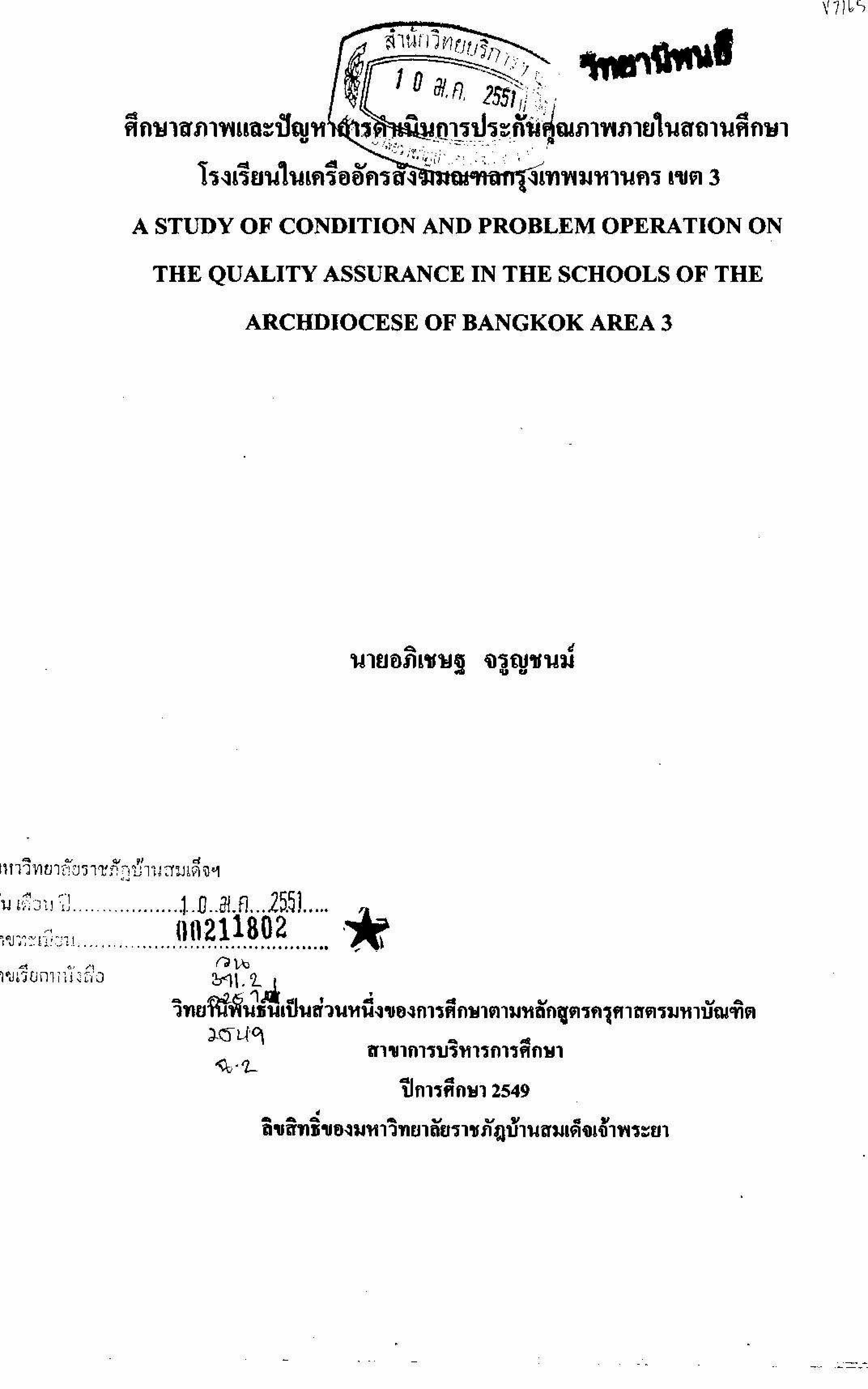 ศึกษาสภาพและปัญหาการดำเนินการประกันคุณภาพภายในสถานศึกษาโรงเรียนในเครืออัครสังฆมณฑลกรุงเทพมหานคร เขต 3