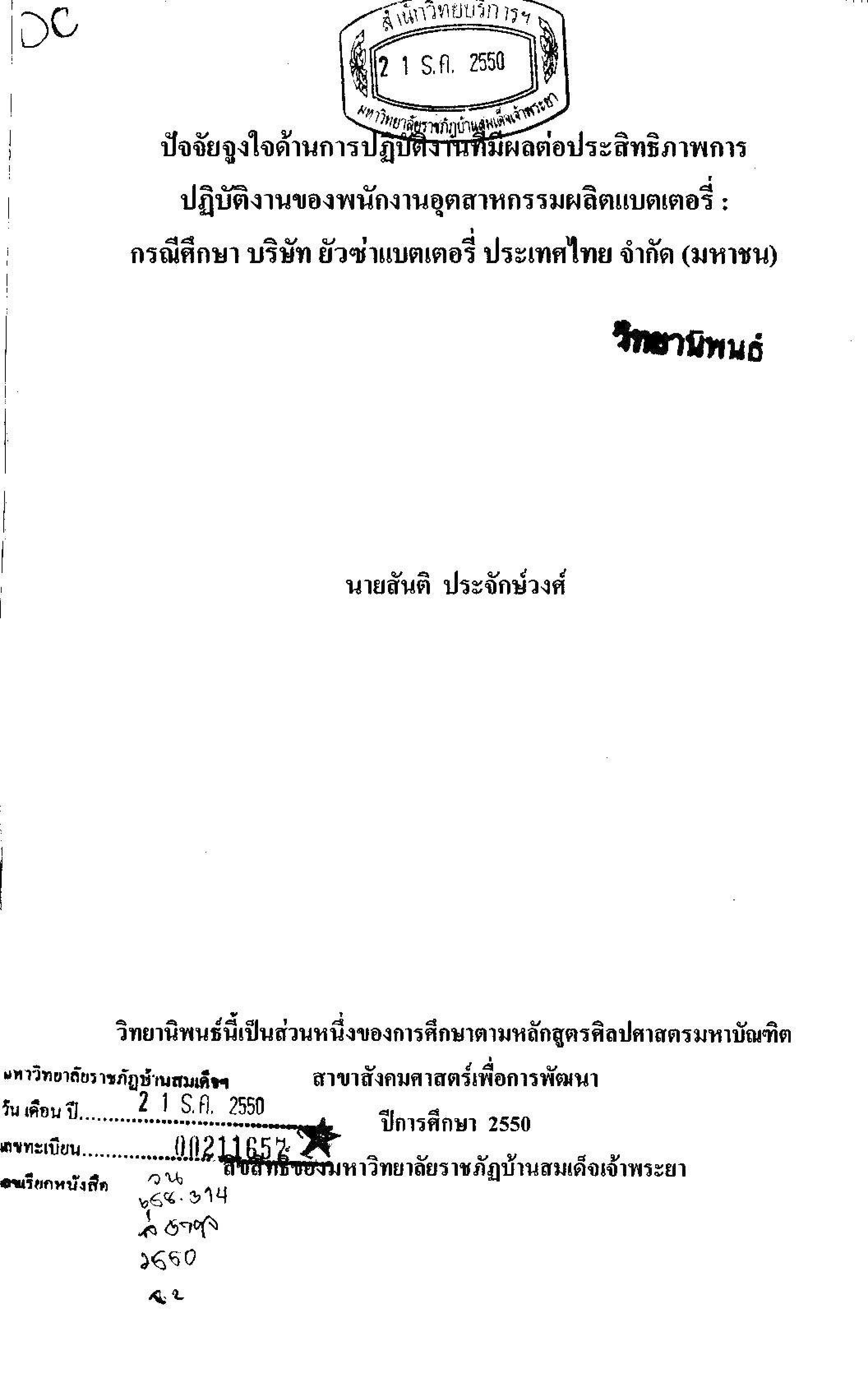 ปัจจัยจูงใจด้านการปฏิบัติงานที่มีผลต่อประสิทธิภาพการปฏิบัติงานของพนักงานอุตสาหกรรมผลิตแบตเตอรี่: กรณีศึกษา บริษัทยัวซ่าแบตเตอรี่ ประเทศไทย จำกัด (มหาชน)