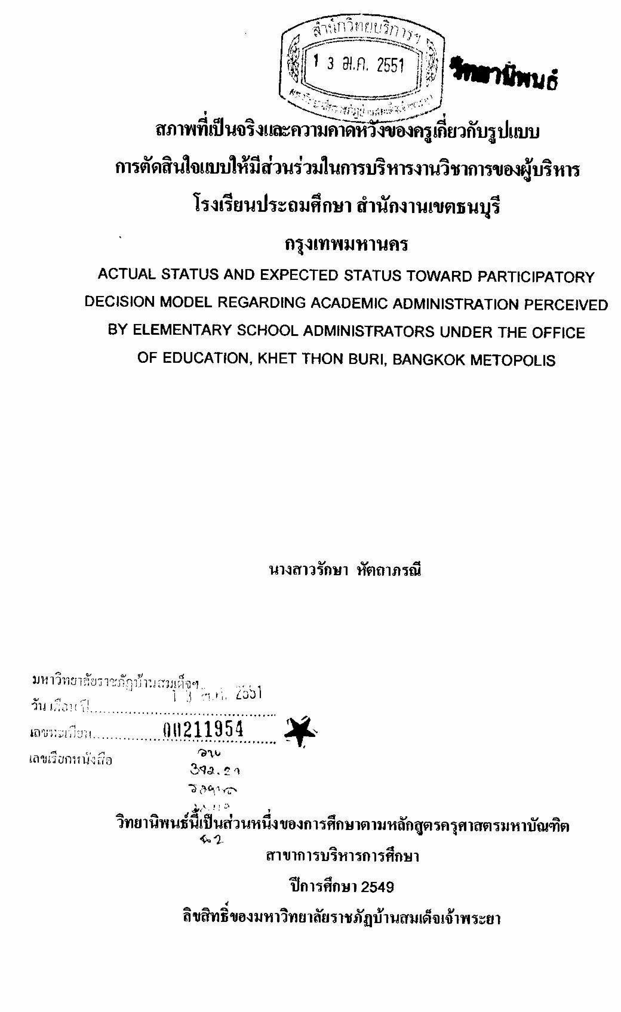 สภาพที่เป็นจริงและความคาดหวังของครูเกี่ยวกับรูปแบบการตัดสินใจแบบให้มีส่วนร่วมในการบริหารโรงเรียนประถมศึกษา สำนักงานเขตธนบุรี กรุงเทพมหานคร