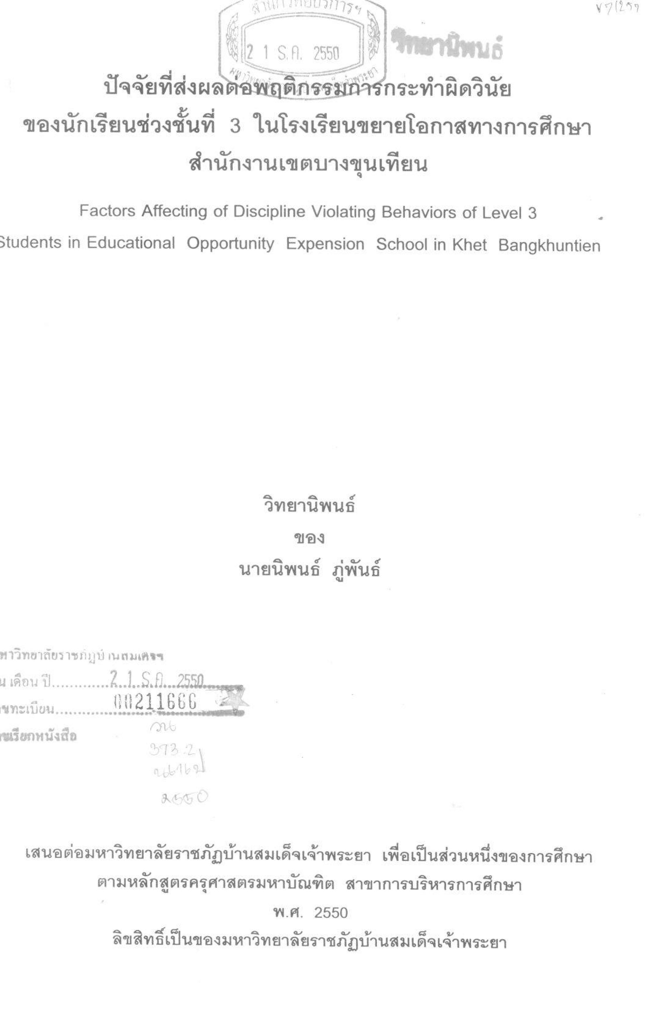 ปัจจัยที่ส่งผลต่อพฤติกรรมการกระทำผิดวินัยของนักเรียนช่วงชั้นที่ 3 ในโรงเรียนขยายโอกาสทางการศึกษา สำนักงานเขตบางขุนเทียน