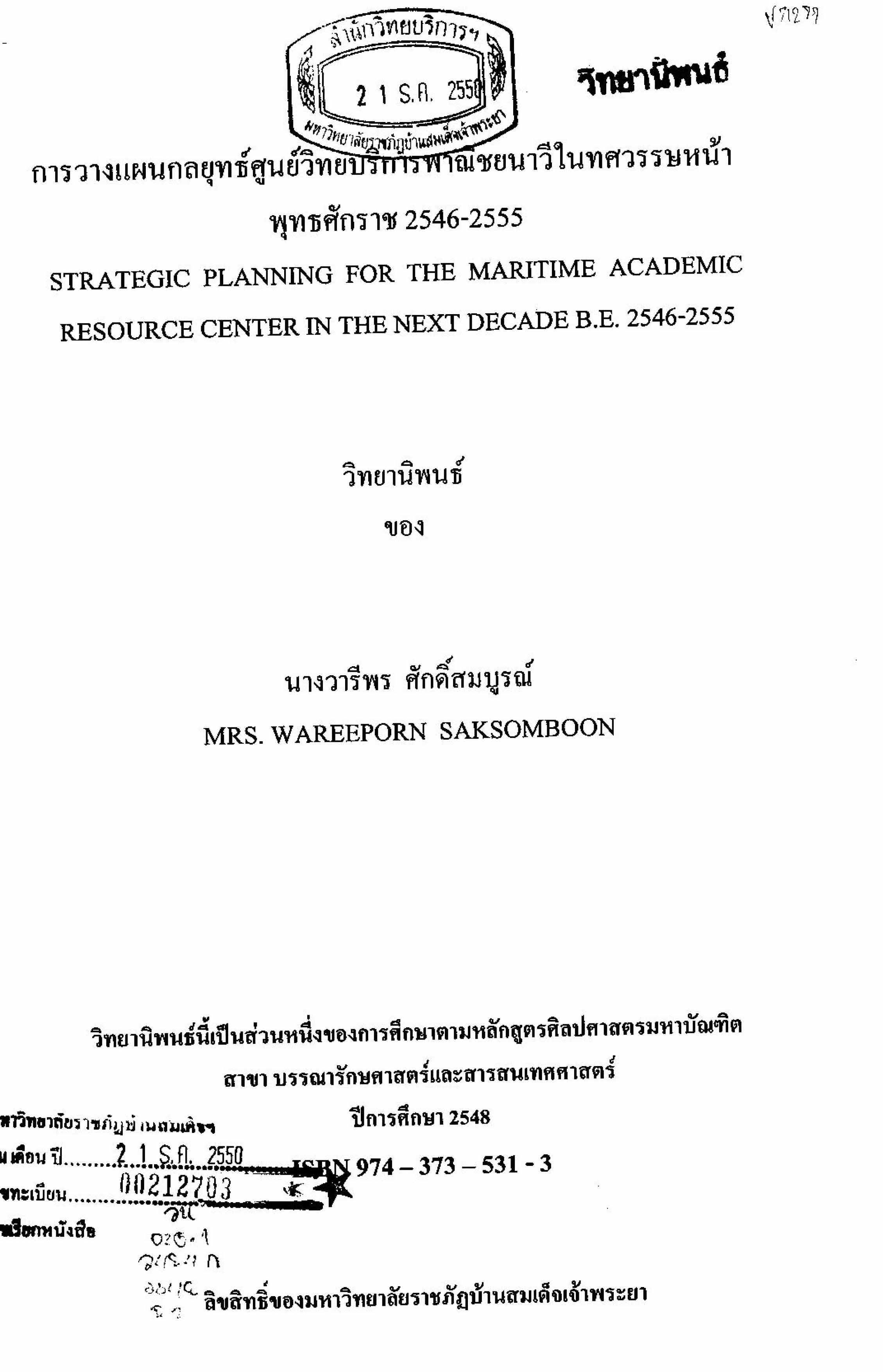 การวางแผนกลยุทธ์ศูนย์วิทยบริการพาณิชยนาวีในทศวรรษหน้า พุทธศักราช 2546-2555