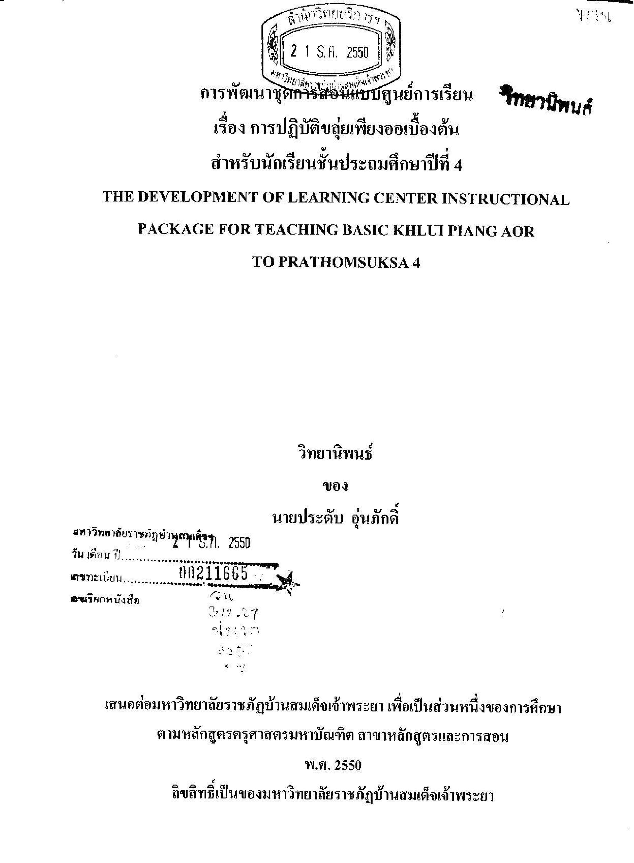 การพัฒนาชุดการสอนแบบศูนย์การเรียน เรื่อง การปฏิบัติขลุ่ยเพียงออเบื้องต้นสำหรับนักเรียนชั้นประถมศึกษาปีที่ 4