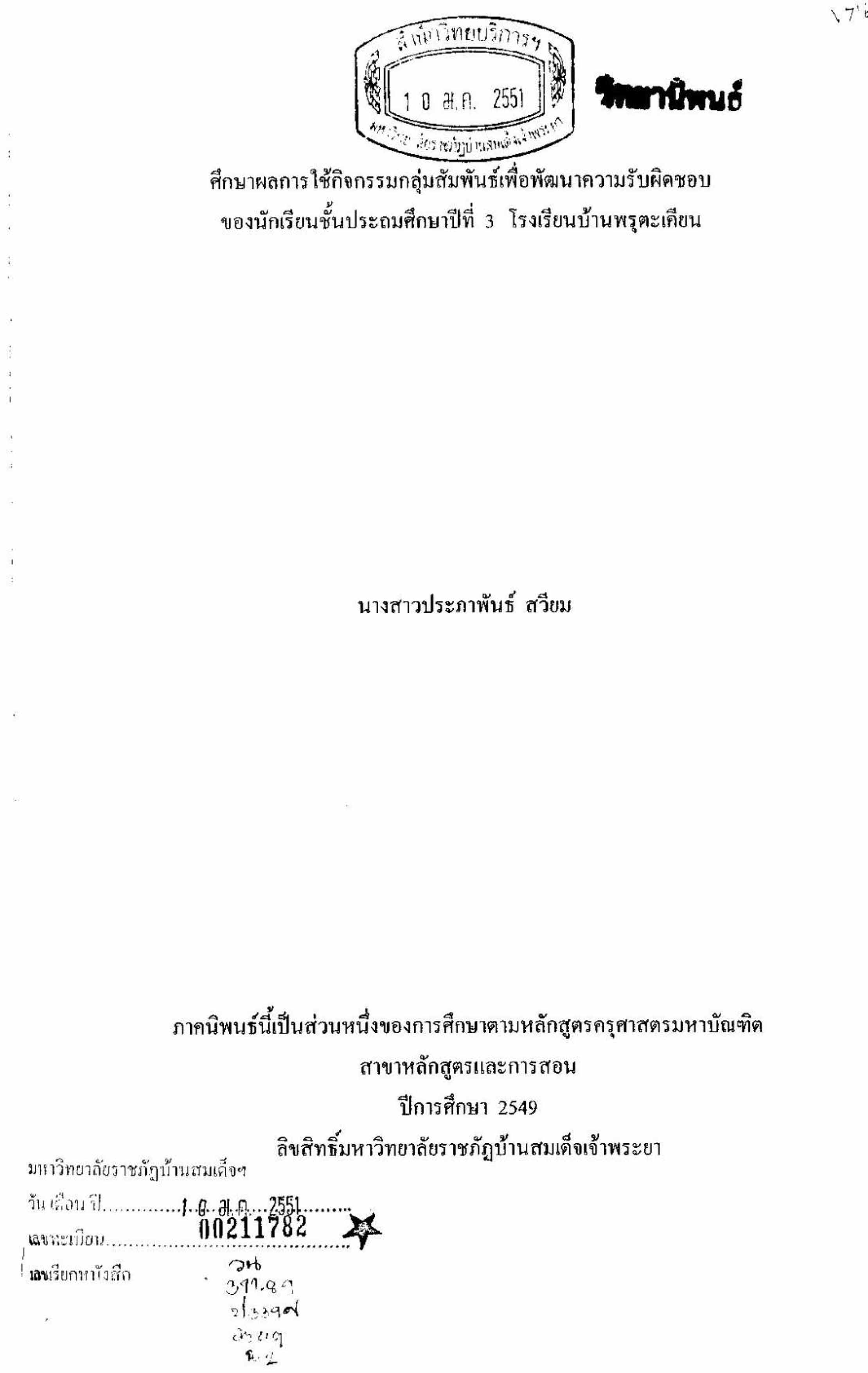 ศึกษาผลการใช้กิจกรรมกลุ่มสัมพันธ์เพื่อพัฒนาความรับผิดชอบของนักเรียนชั้นประถมศึกษาปีที่ 3 โรงเรียนบ้านพรุตะเคียน