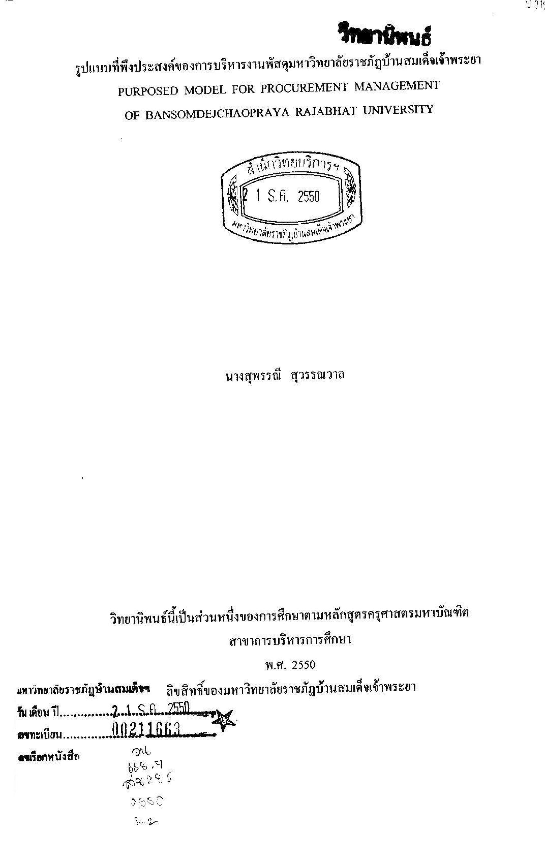 รูปแบบที่พึงประสงค์ของการบริหารงานพัสดุมหาวิทยาลัยราชภัฏบ้านสมเด็จเจ้าพระยา