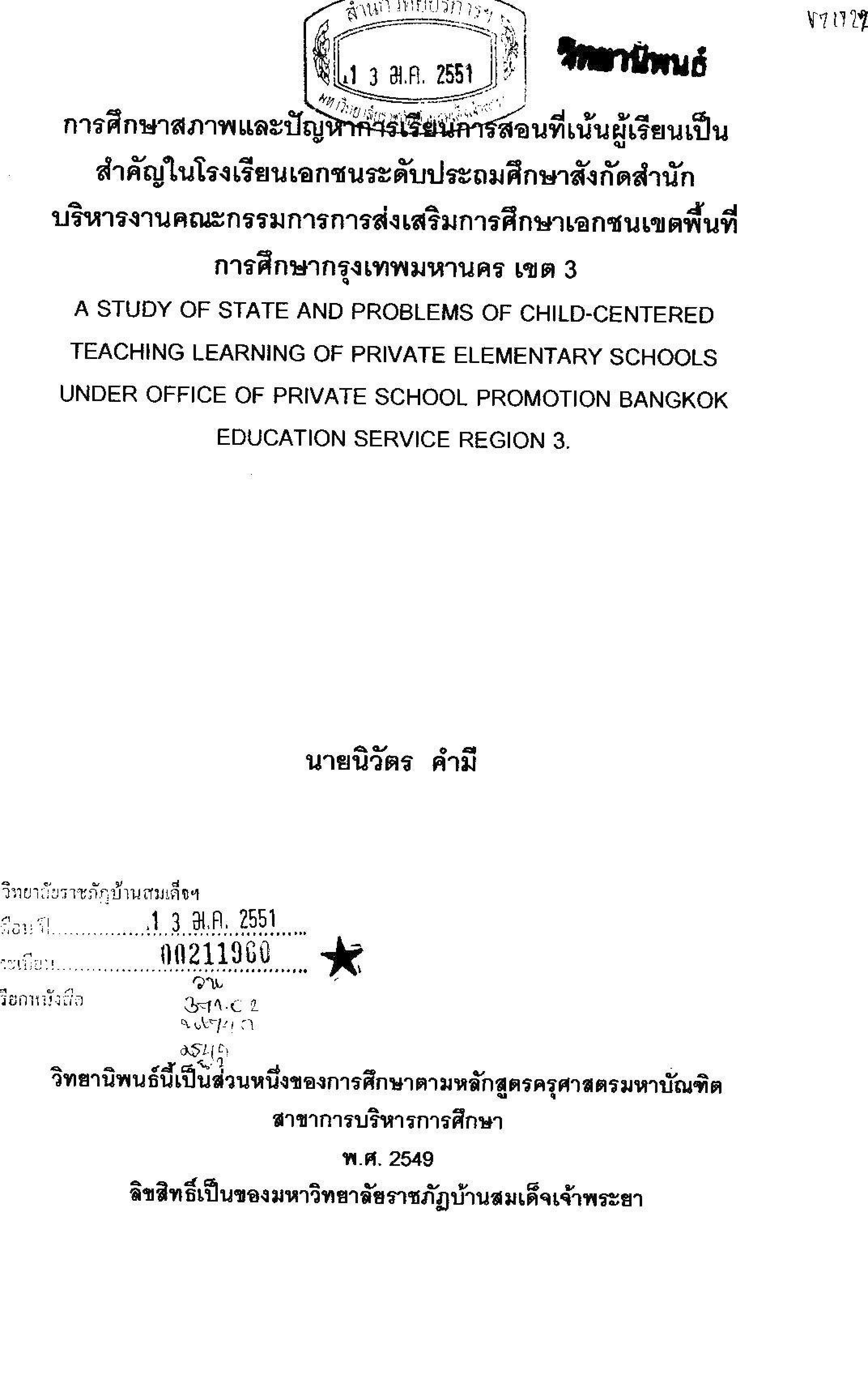 การศึกษาสภาพและปัญหาการเรียนการสอนที่เน้นผู้เรียนเป็นสำคัญในโรงเรียนเอกชนระดับประถมศึกษาสังกัดสำนักงานบริหารงานคณะกรรมการการส่งเสริมการศึกษาเอกชนเขตพื้นที่ การศึกษากรุงเทพมหานคร เขต 3
