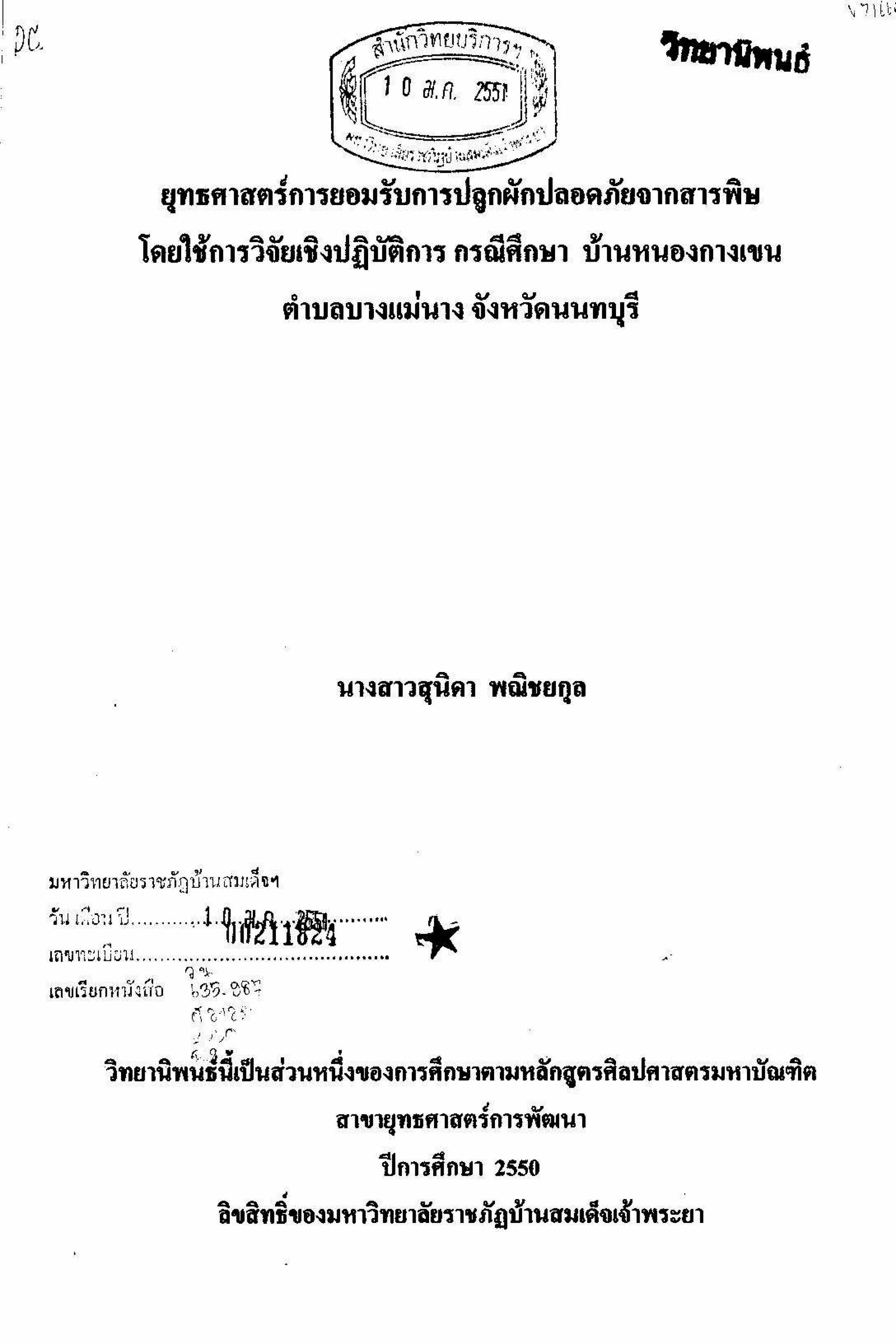 ยุทธศาสตร์การยอมรับการปลูกผักปลอดภัยจากสารพิษโดยใช้การวิจัยเชิงปฏิบัติงาน กรณีศึกษา บ้านหนองกางเขน ตำบลบางแม่นาง จังหวัดนนทบุรี