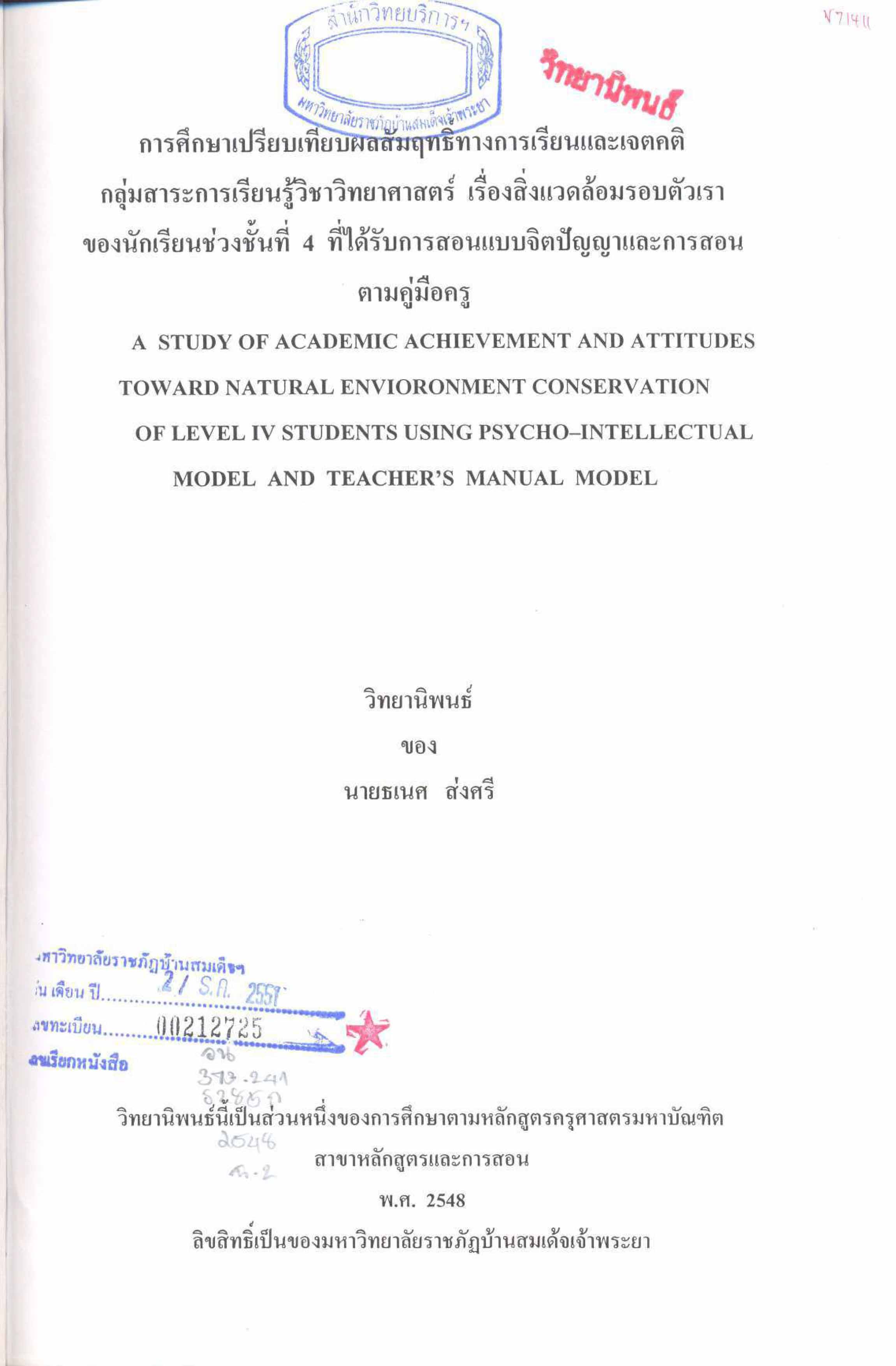 การศึกษาเปรียบเทียบผลสัมฤทธิ์ทางการเรียนและเจตคติกลุ่มสาระการเรียนรู้วิชาวิทยาศาสตร์ เรื่องสิ่งแวดล้อมตัวเราของนักเรียนช่วงชั้นปีที่ 4 ที่ได้รับการสอนแบบจิตปัญญาและการสอนตามคู่มือครู