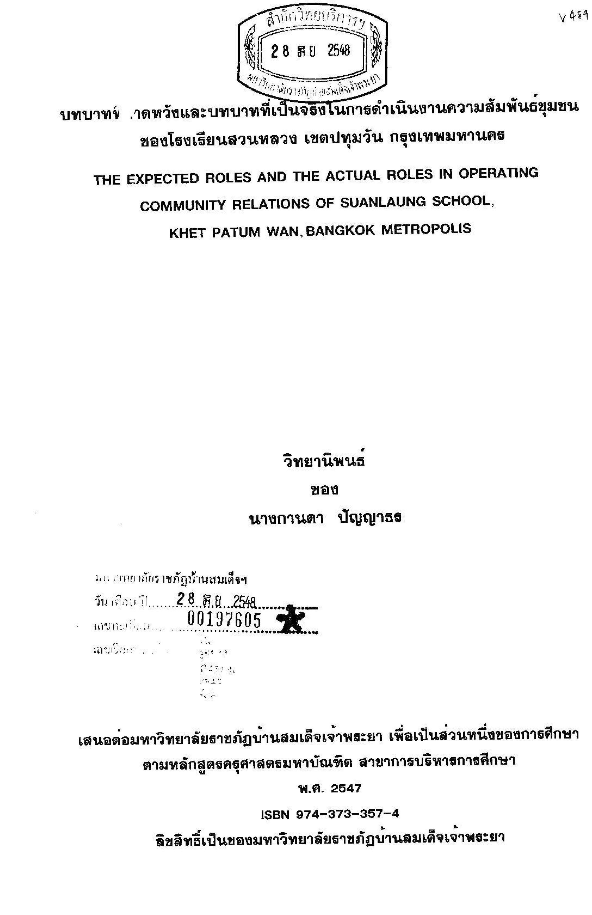 บทบาทที่คาดหวังและบทบาทที่เป็นจริงในการดำเนินงานความสัมพันธ์ชุมชนของโรงเรียนสวนหลวง เขตปทุมวัน กรุงเทพมหานคร