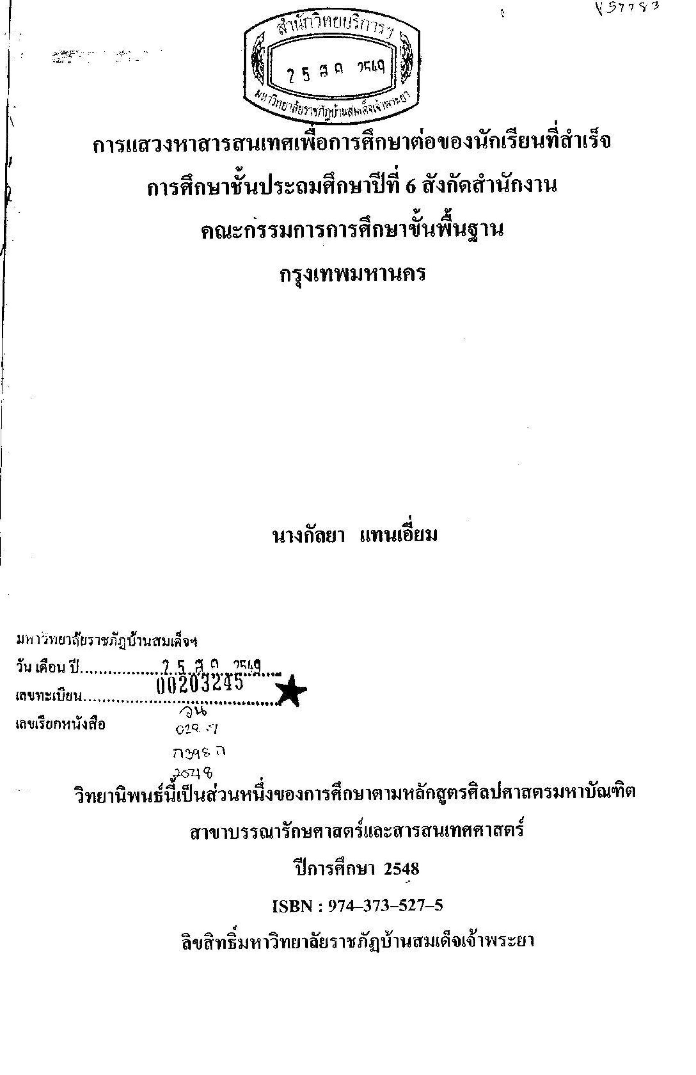 การแสวงหาสารสนเทศเพื่อการศึกษาต่อของนักเรียนที่สำเร็จการศึกษาชั้นประถมศึกษาปีที่ 6 สังกัดสำนักงานคณะกรรมการการศึกษาขั้นพื้นฐานกรุงเทพมหานคร