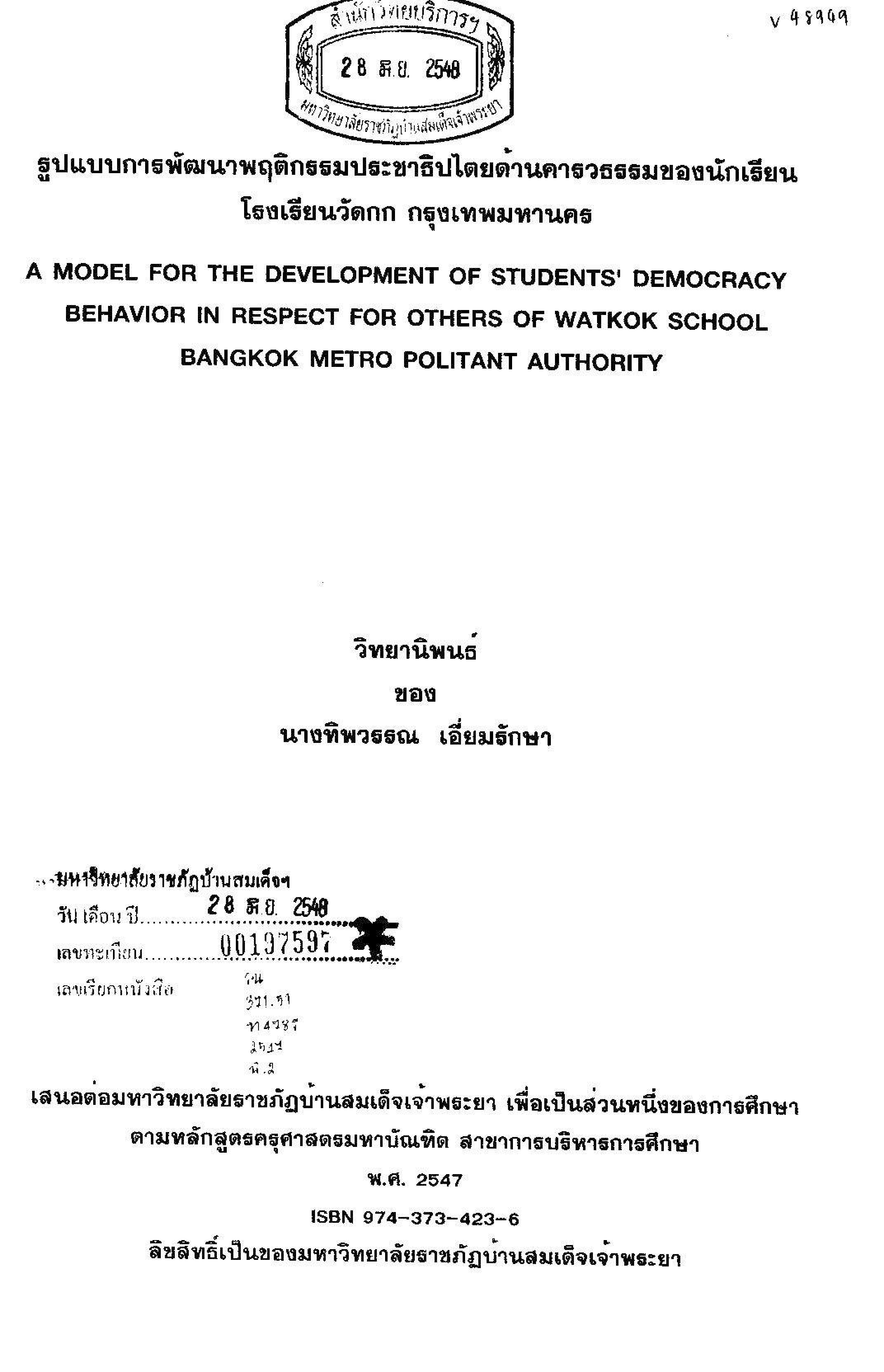 รูปแบบการพัฒนาพฤติกรรมจิตสำนึกประชาธิปไตยของนักเรียนช่วงชั้นที่ 1 (ระดับชั้นประถมศึกษาปีที่ 3) โรงเรียนวัดไทร (ถาวรพรหมานุกูล) สังกัดสำนักงานเขตจอมทอง กรุงเทพมหานคร