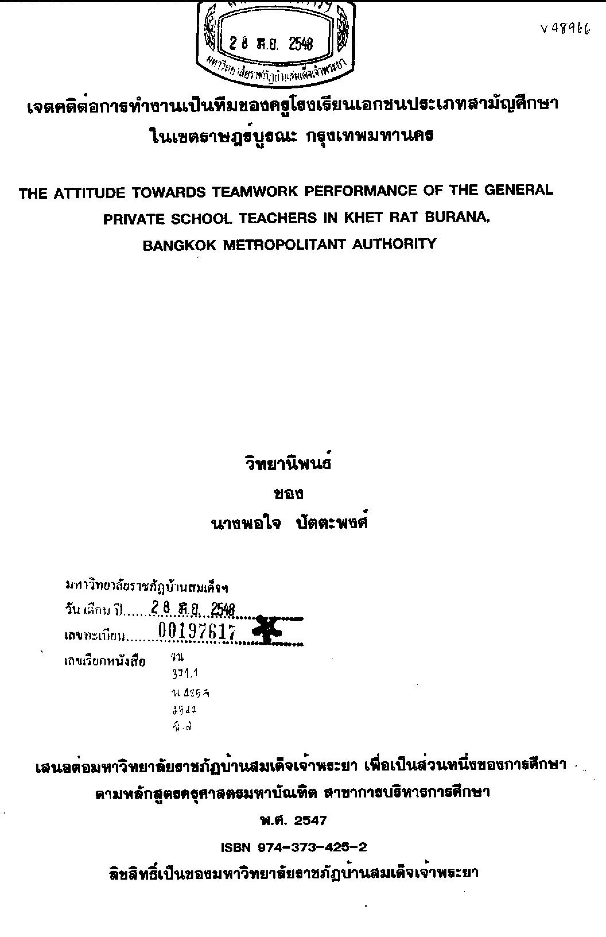 เจตคติต่อการทำงานเป็นทีมของครูโรงเรียนเอกชนประเภทสามัญศึกษาในเขตราษฎร์บูรณะ กรุงเทพมหานคร