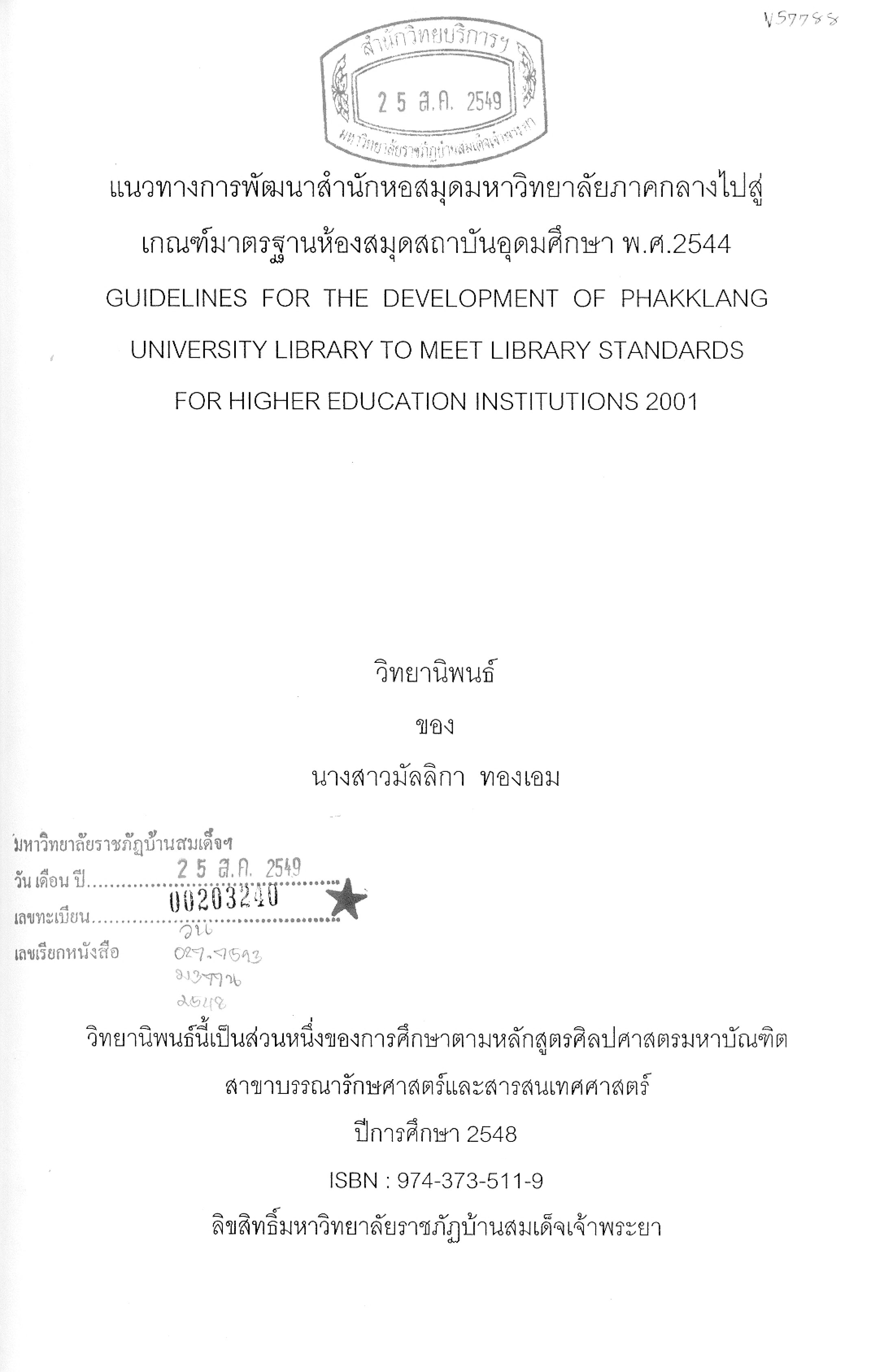 แนวทางพัฒนาสำนักหอสมุดมหาวิทยาลัยภาคกลางไปสู่เกณฑ์มาตรฐานห้องสมุดสภาบันอุดมศึกษา พ.ศ. 2544
