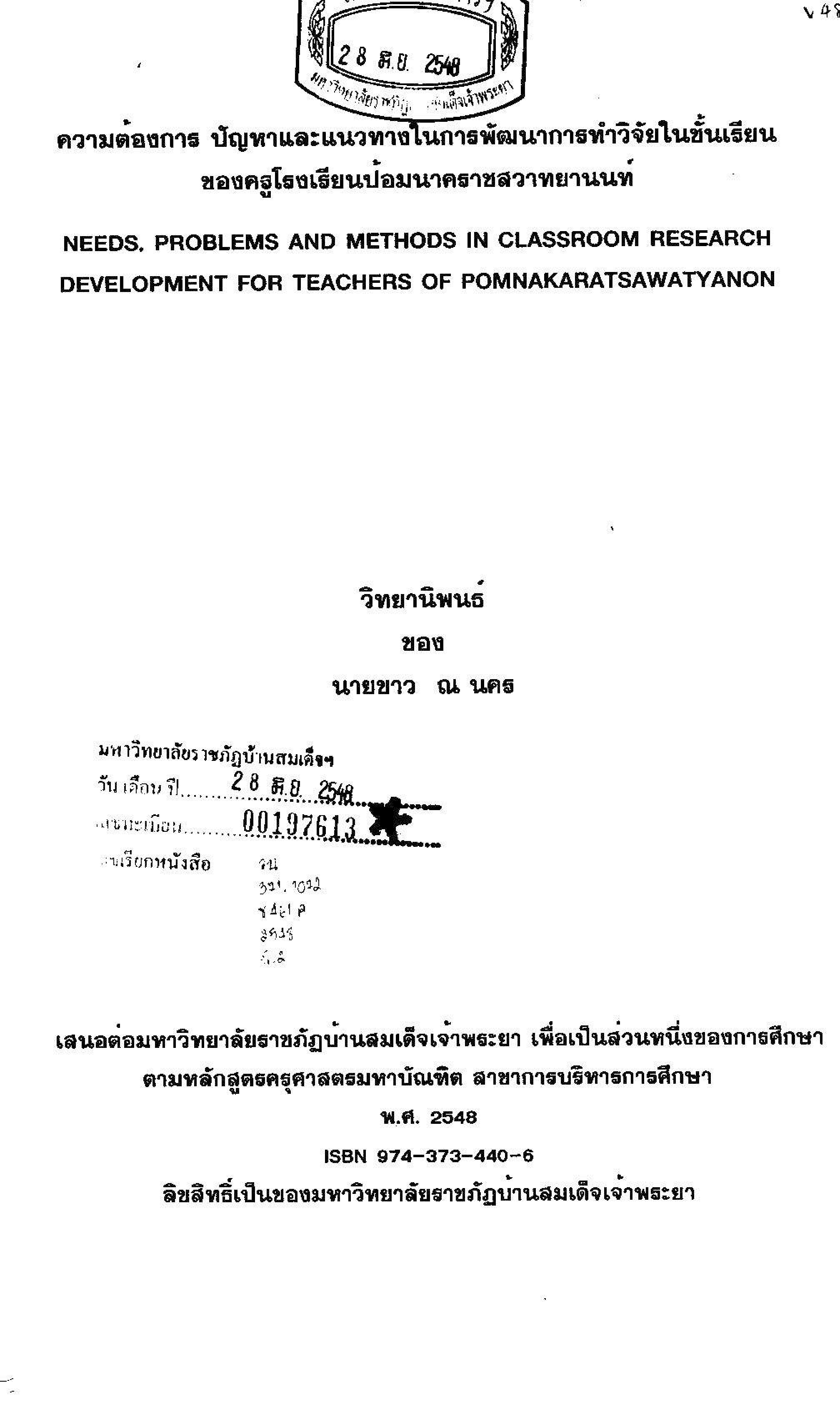 ความต้องการ ปัญหาและแนวทางในการพัฒนาการทำวิจัยในชั้นเรียนของครูโรงเรียป้อมนาคราชสวาทยานนท์