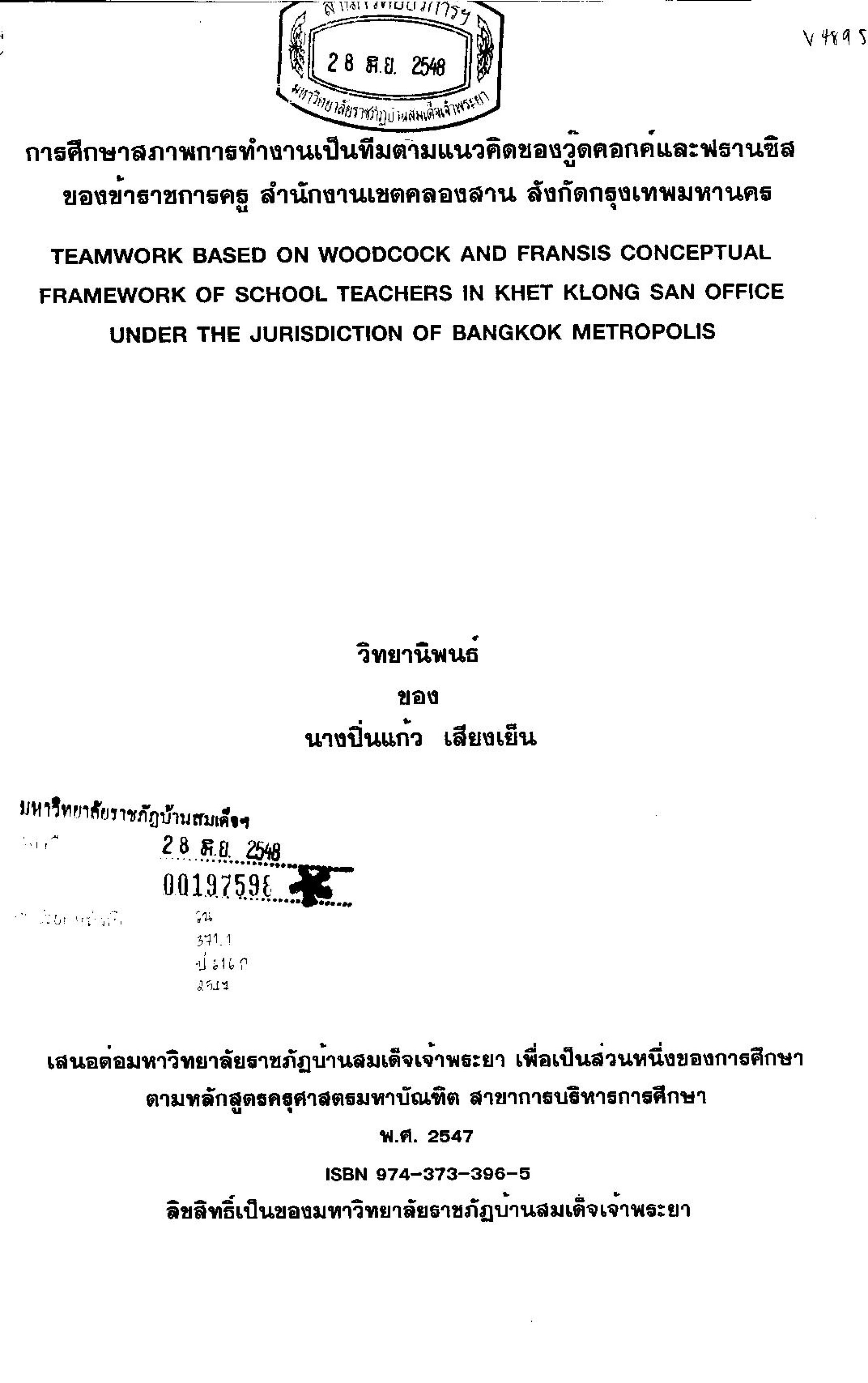 การศึกษาสภาพการทำงานเป็นทีมตามแนวคิดของวู๊ดคอกค์และฟรานซิสของข้าราชการครู สำนักงานเขตคลองสาน สังกัดกรุงเทพมหานคร
