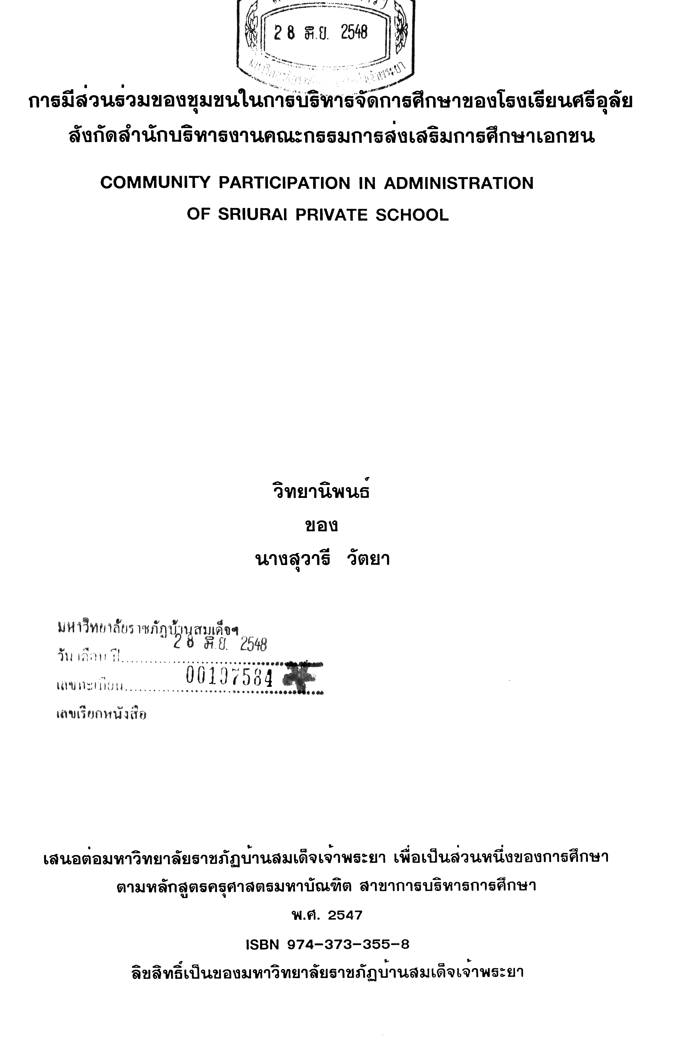 การมีส่วนร่วมของชุมชนในการบริหารจัดการศึกษาของโรงเรียนศรีอุลัย สังกัดสำนักบริหารงานคณะกรรมการส่งเสริมการศึกษาเอกชน
