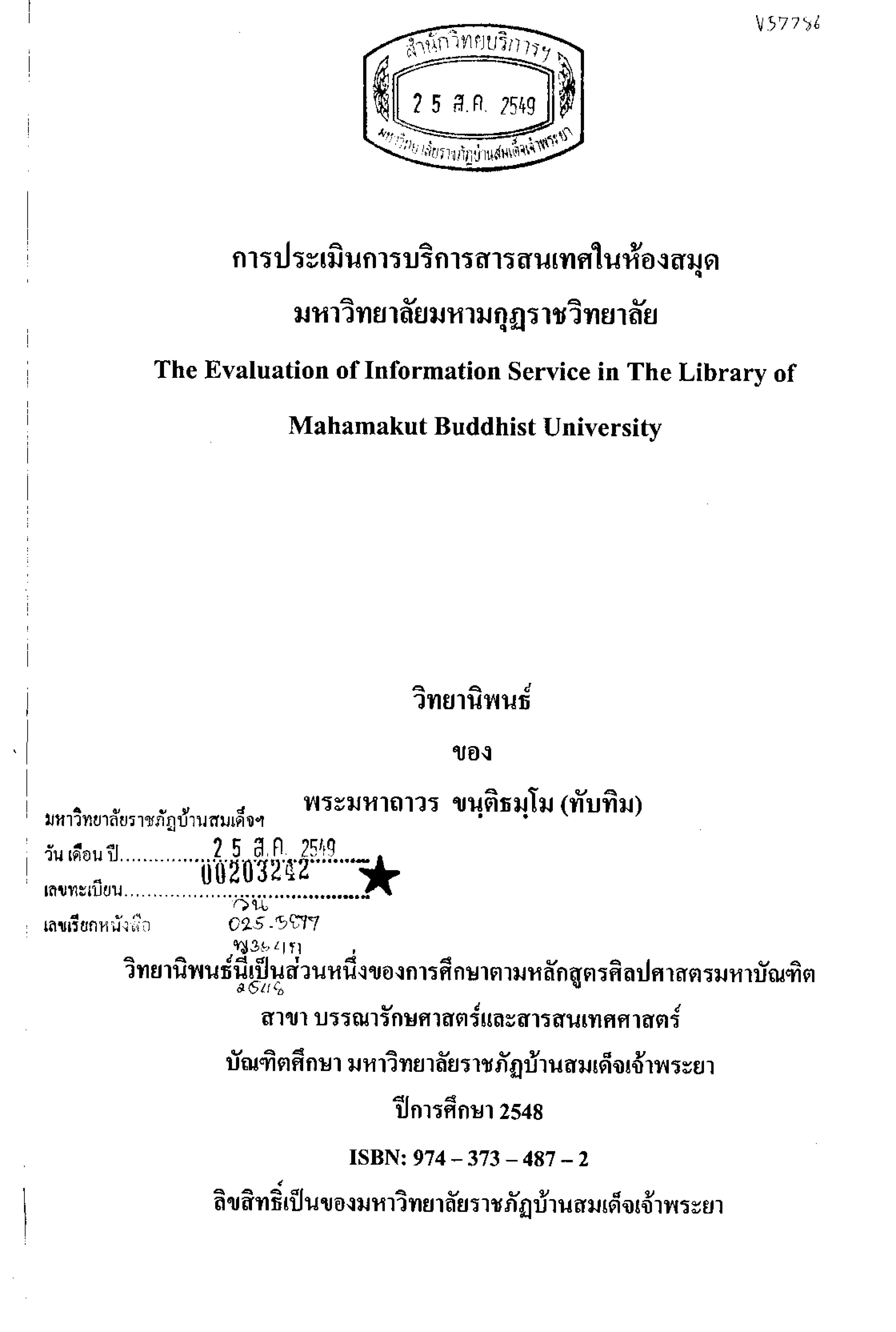 การประเมินการบริการสารสนเทศในห้องสมุด มหาวิทยาลัยมหามกุฎราชวิทยาลัย