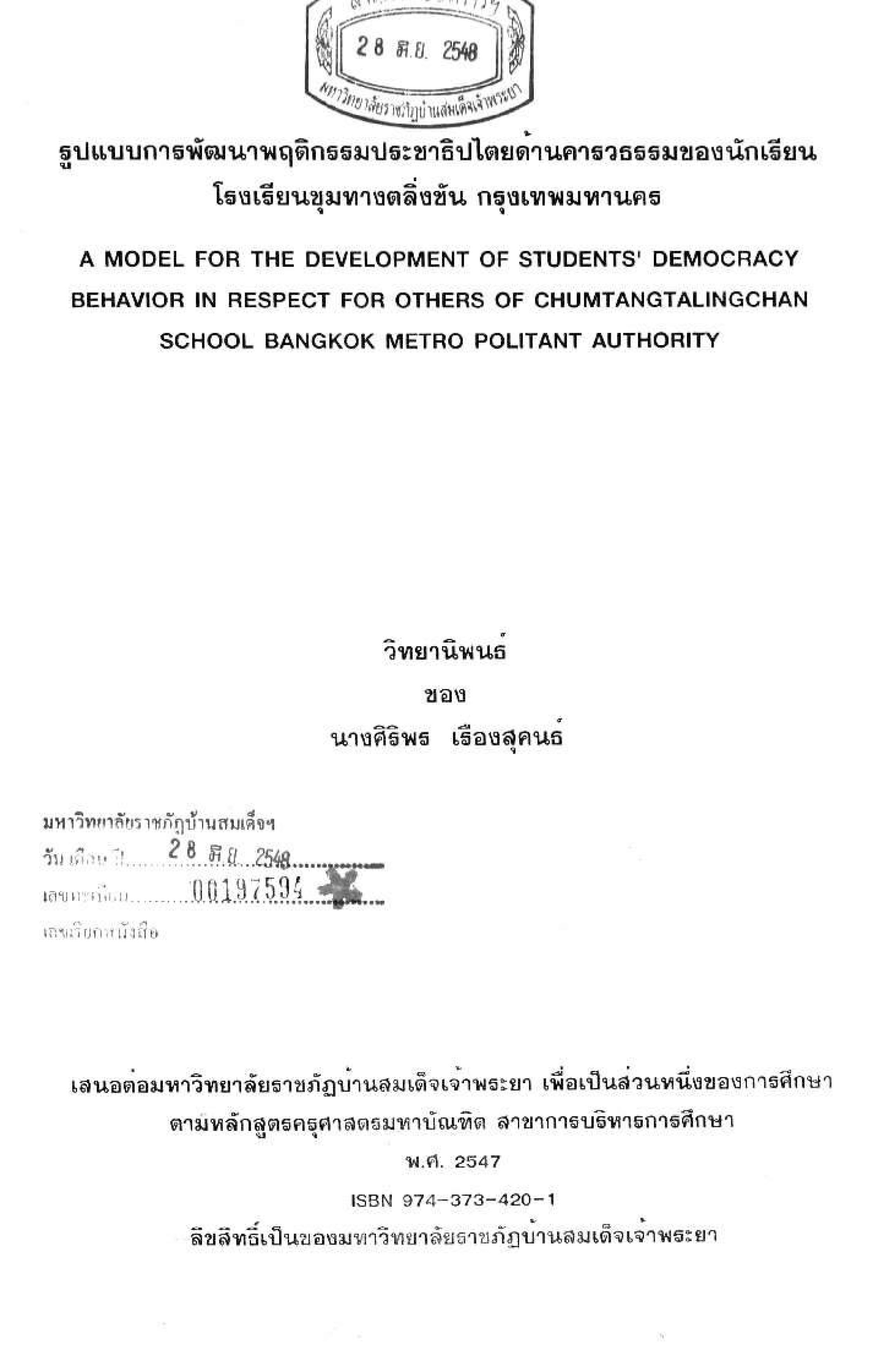 รูปแบบการพัฒนาพฤติกรรมประชาธิปไตยด้านคารวธรรมของนักเรียนโรงเรียนชุมทางตลิ่งชัน กรุงเทพมหานคร