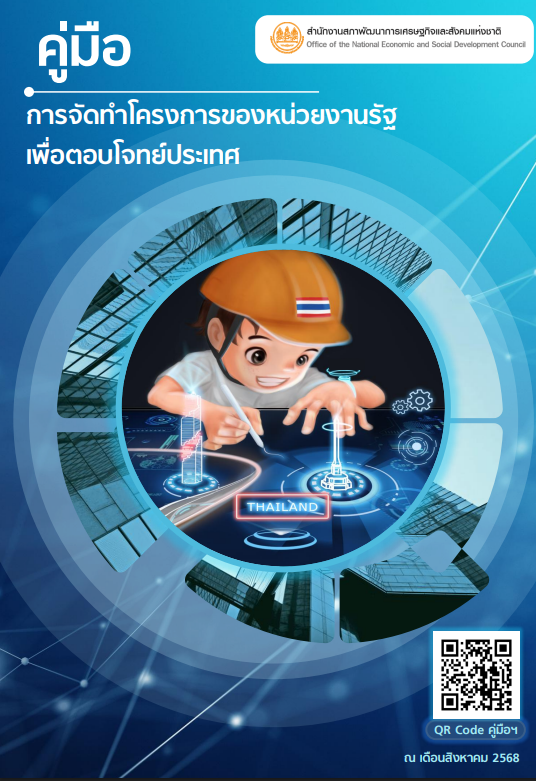 คู่มือการจัดทำโครงการของหน่วยงานรัฐเพื่อตอบโจทย์ประเทศ ของสำนักงานสภาพัฒนาการเศรษฐกิจและสังคมแห่งชาติ (สศช.) เพื่อให้หน่วยงานภาครัฐสามารถสร้างแผนงานที่สอดคล้องกับ ยุทธศาสตร์ชาติและแผนแม่บท ได้อย่างมีประสิทธิภาพ เนื้อหาครอบคลุมกระบวนการตั้งแต่ การวิเคราะห์ห่วงโซ่คุณค่าประเทศไทย (FVCT) การกำหนดชื่อโครงการ และการตั้งวัตถุประสงค์ตามหลัก SMART ที่ชัดเจน นอกจากนี้ยังให้ความสำคัญกับการใช้ ระบบฐานข้อมูล Big Data และ AI เช่น ระบบ TPMAP มาเป็นเครื่องมือหลักในการแก้ไขปัญหาความยากจนและการพัฒนาคน คู่มือยังแนะนำเทคนิคการบริหารงานแบบ PDCA พร้อมเครื่องมือจัดลำดับความสำคัญอย่าง Eisenhower Matrix เพื่อให้การใช้งบประมาณเกิดประโยชน์สูงสุด สุดท้ายยังมี Worksheet สำหรับฝึกปฏิบัติจริงเพื่อให้ผู้ใช้งานสามารถออกแบบโครงการที่มีความเชื่อมโยงกันตั้งแต่ระดับกิจกรรมไปจนถึงผลลัพธ์ในระยะยาว
