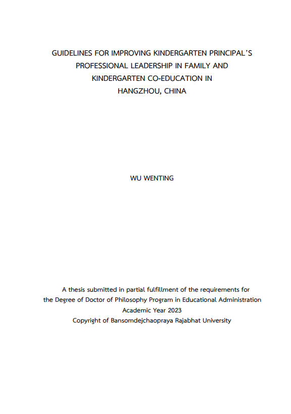 The objectives of this research were: 1) to study the components of kindergarten principal’s professional leadership in family and kindergarten coeducation 2) to analyze the current situation of kindergarten principal’s professional leadership in family and kindergarten co-education 3) to develop guidelines for improving kindergarten principal’s professional leadership in family and kindergarten co-education 4) to evaluate guidelines for improving kindergarten principal’s professional leadership in family and kindergarten co-education. The sample were 285 principals from the population of 1042 kindergarten principals in 8 representative districts of Hangzhou. Research instruments include: 1) content analysis, 2) questionnaire, 3) structured interview, and 4) evaluation form. Data analysis by using percentage, mean, standard deviation and content analysis The results were found that the components of kindergarten principal’s professional leadership in family and kindergarten co-education includes four variables, idea resonance ability, professional support ability, organization and coordination ability and sustainable development ability. The current situation of kindergarten principal’s professional leadership in family and kindergarten coeducation was that the highest was idea resonance ability, the second was sustainable development ability, the third was professional development ability and the lowest was organization and coordination ability. There were 43 guidelines for improving kindergarten principal’s professional leadership in family and kindergarten coeducation in Hangzhou, China. The suitability and feasibility of guidelines for improving kindergarten principal’s professional leadership in family and kindergarten coeducation in Hangzhou, China were at the highest level with values between 4.50 and 5.00, which mean the guidelines for improving kindergarten principal’s professional leadership in family and kindergarten co-education were suitability and feasibility. Keywords: Kindergarten Principal, Professional Leadership, Family and Kindergarten Co-education
